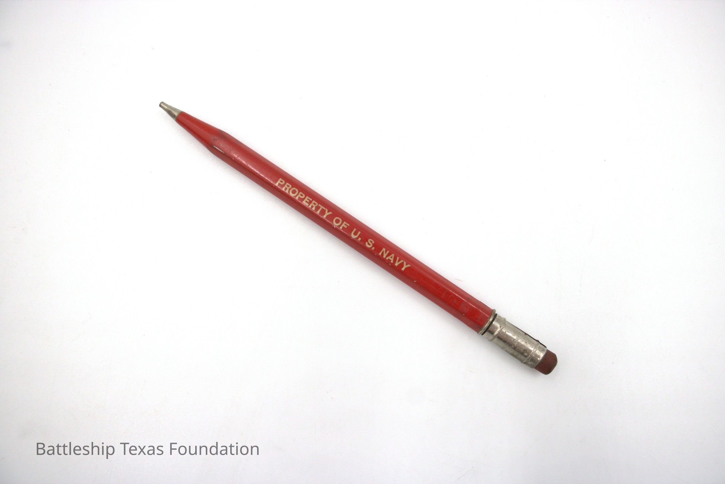 Red mechanical pencil owned by Charles Pratt with "PROPERTY OF U.S. NAVY" lettering on the side. Pencil was stored in bicorne hat box. Missing clasp at end.Context