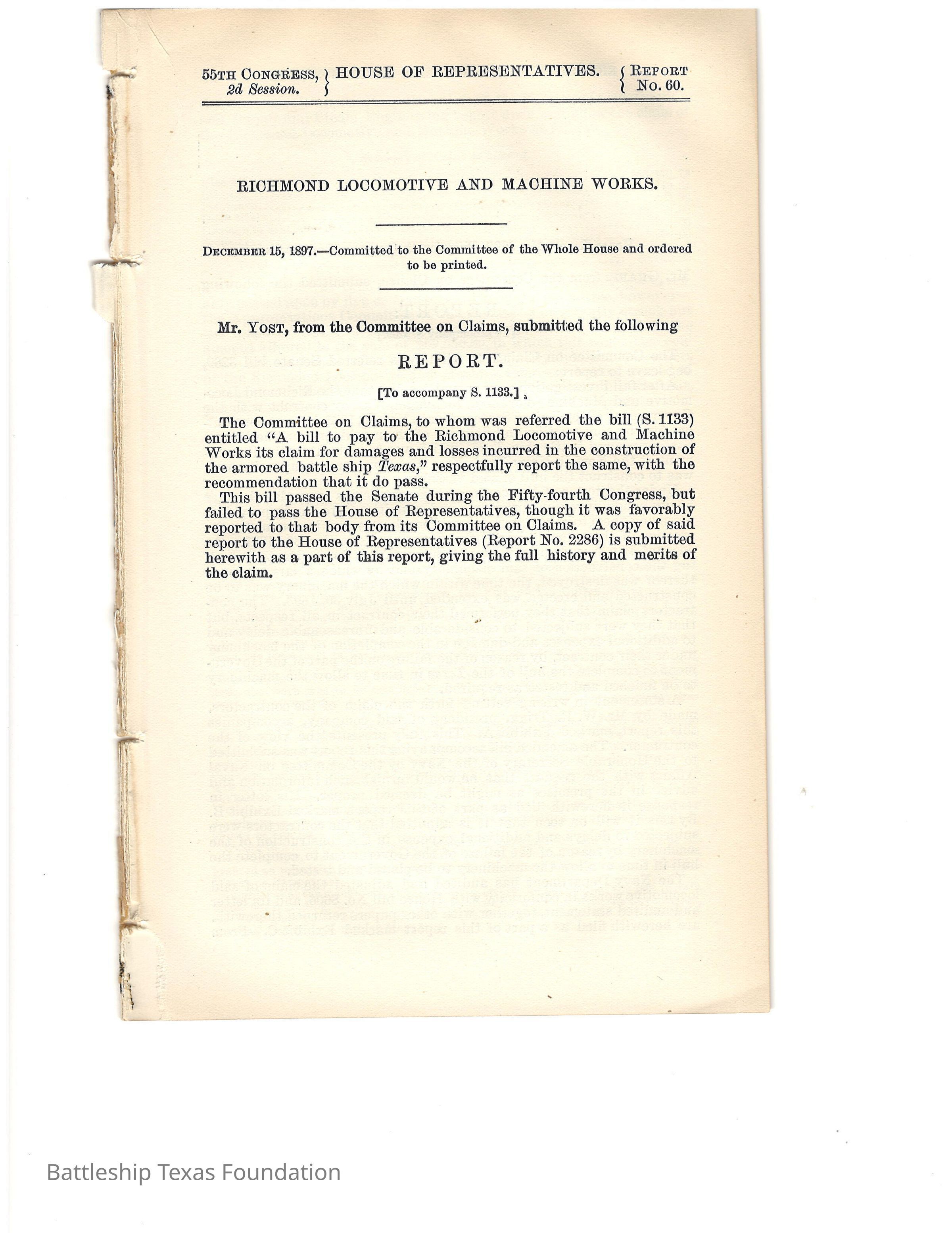 Congressional Report for the 55th Congress 2nd session regarding legislation to compensate the Richmond Locomotive and Machine Works for damages incurred during their construction of the first battleship Texas.