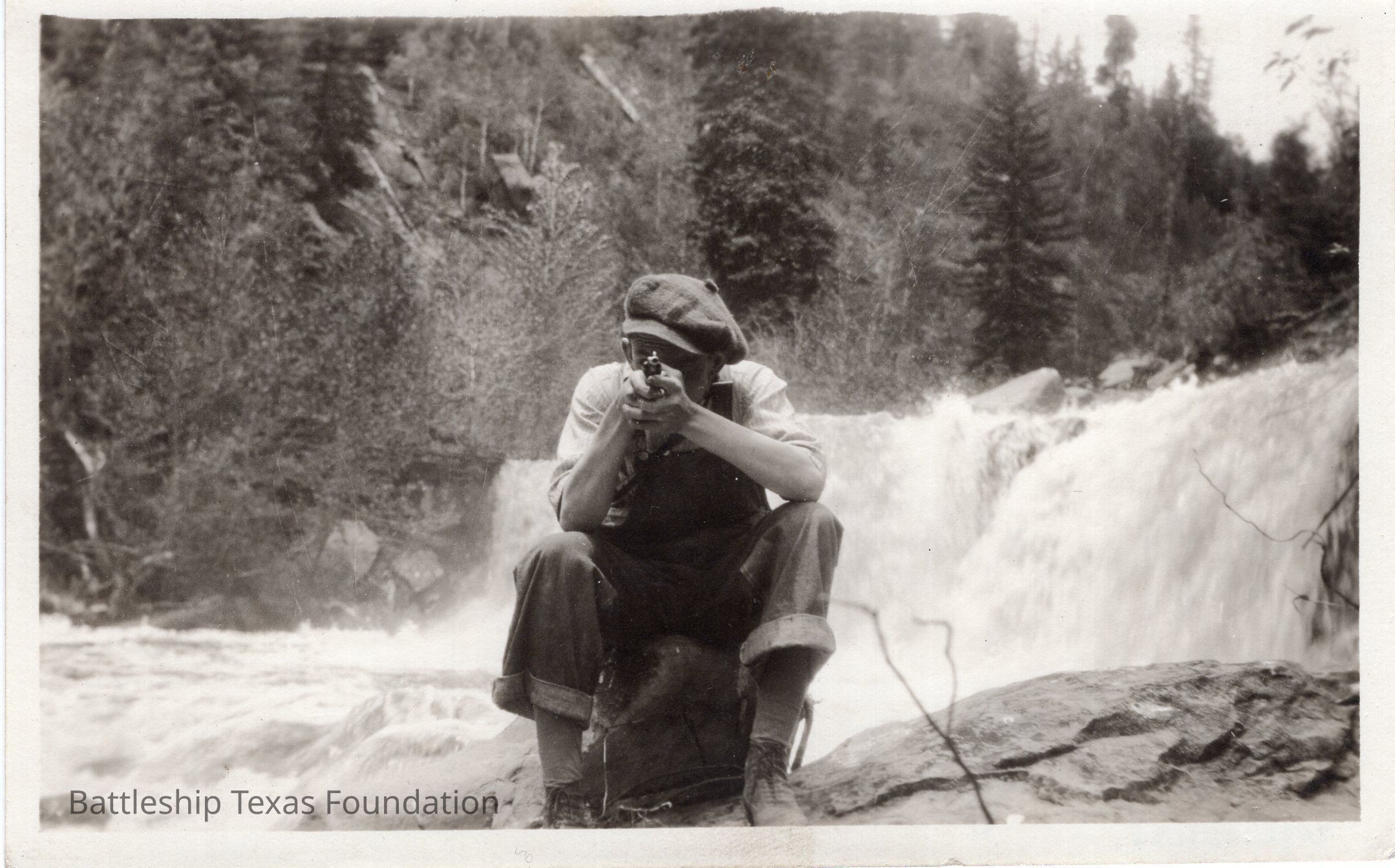 A man sitting next to a waterfall points a revolver at the camera. Pine trees in background.