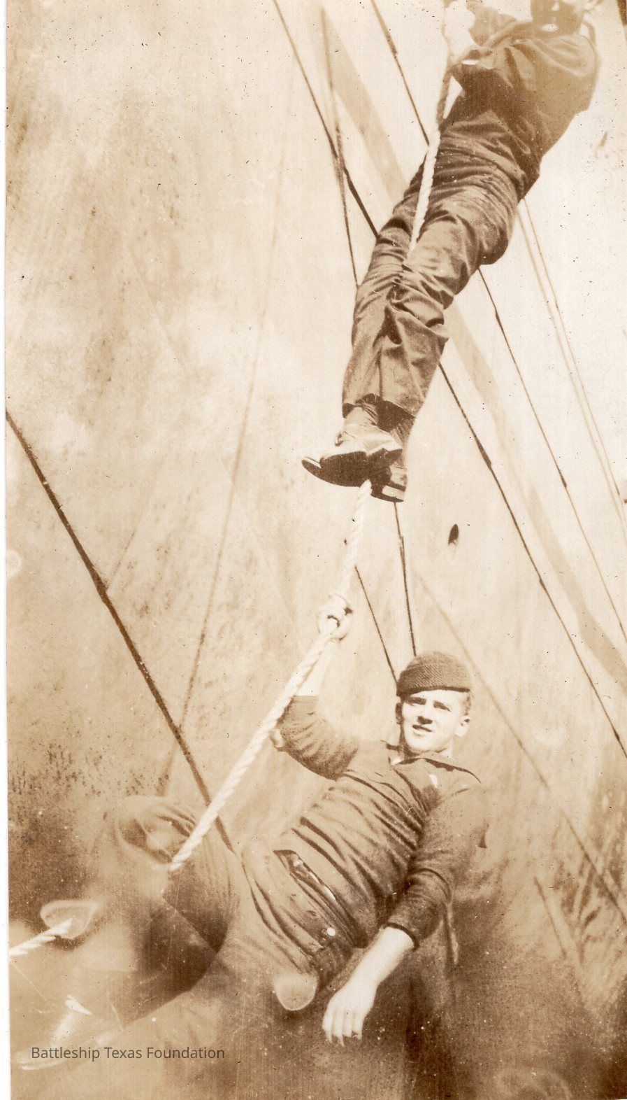 Features two men climbing up a rope throw over the side of the ship. Hull visible behind the men and rope.Context