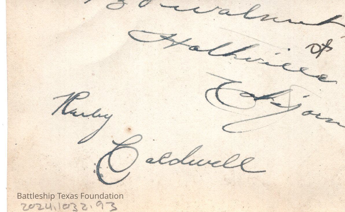 From a donated collection of individual photographs and pages out of a 1930s Texas crewmember's photo album. Items donated by the Los Angeles Maritime Museum. Many photographs had writing on the pages of the book, now discarded. The caption formerly on the page for this photo read, "RUBY CALDWELL"