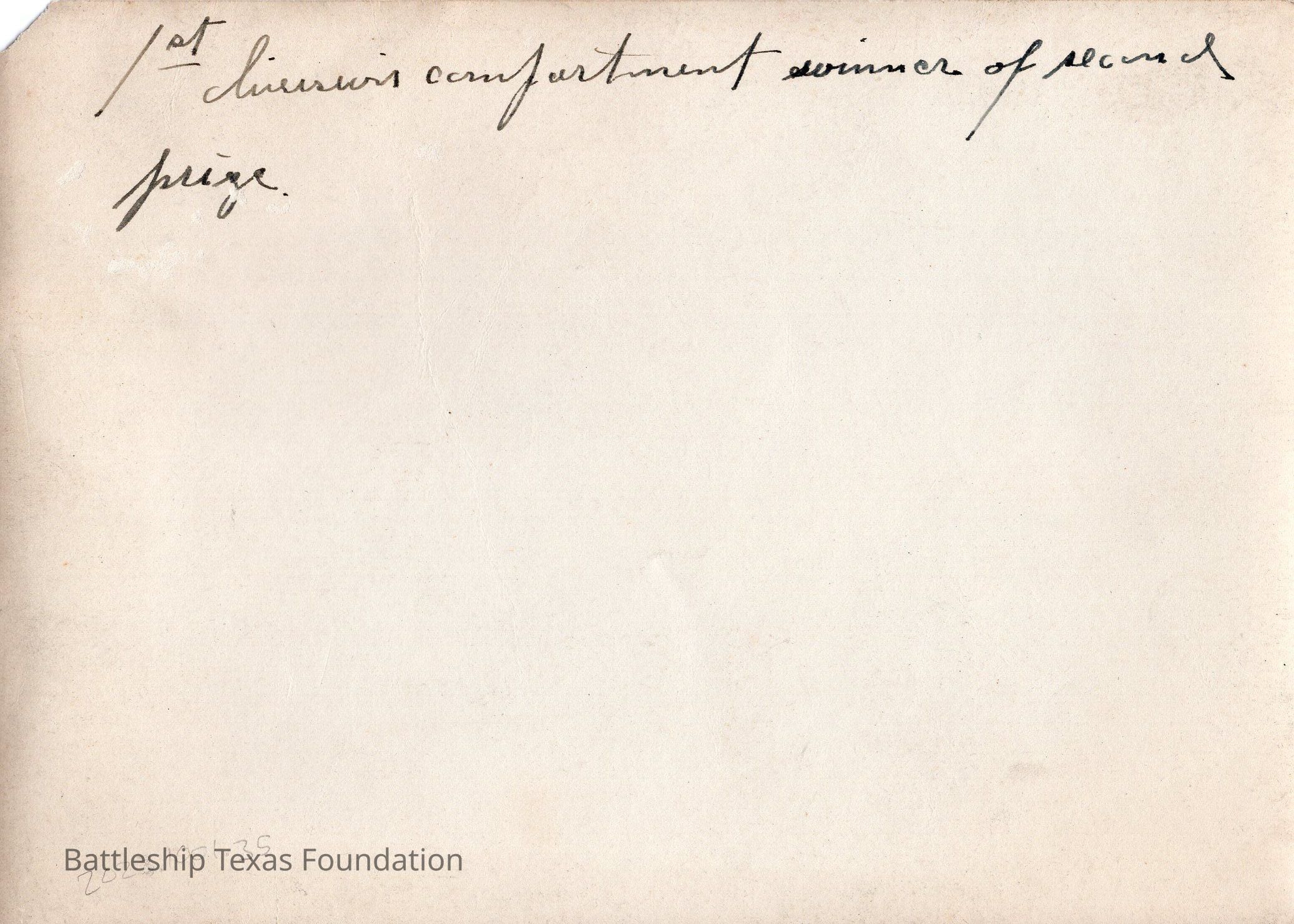Sailors relax in decorated compartment. Desk on left of photo, and tree in background. Back says "1st division compartment winner of second prize"