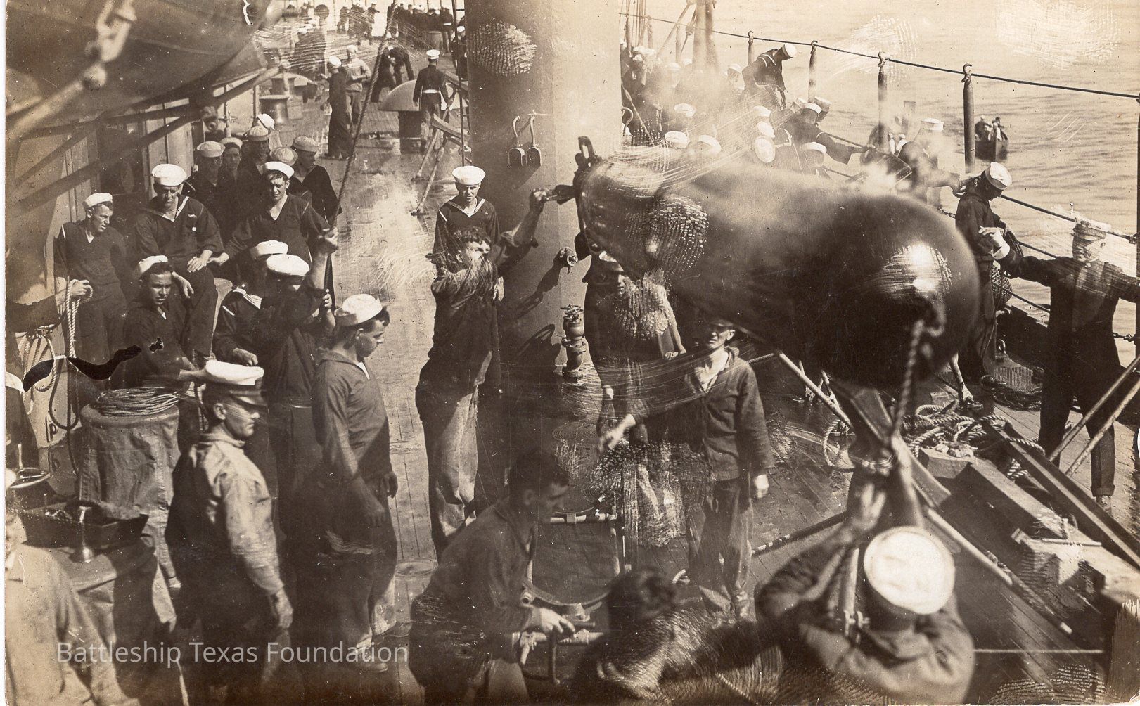 Sailors moving torpedo directed by officer on right of photograph. Ocean to right. Letter on the back remarks on torpedo capability to sink a battleship.Context