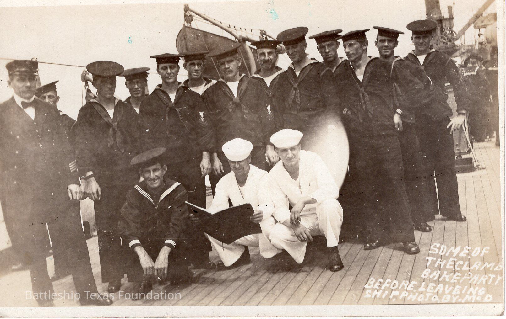 Slanted photograph angle. Two men in whites, one holding a book/folder. Written in white "SOME OF THE CLAM BAKE PARTY BEFORE LEAVING SHIP. PHOTO BY M.D." Back says in pencil "Newport RI / USS Texas"Context