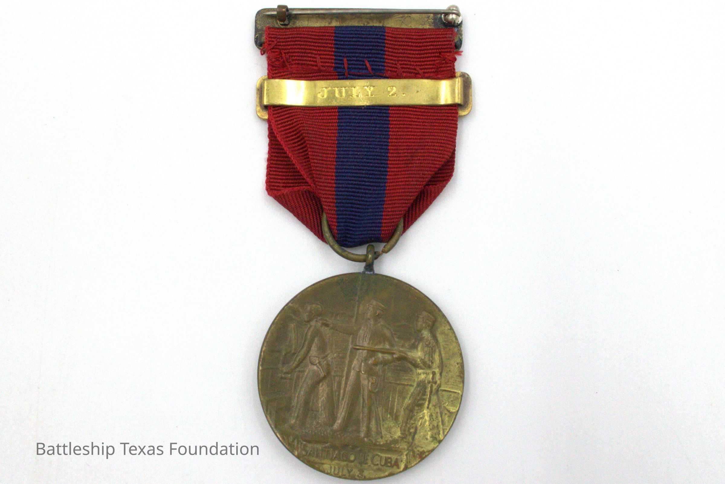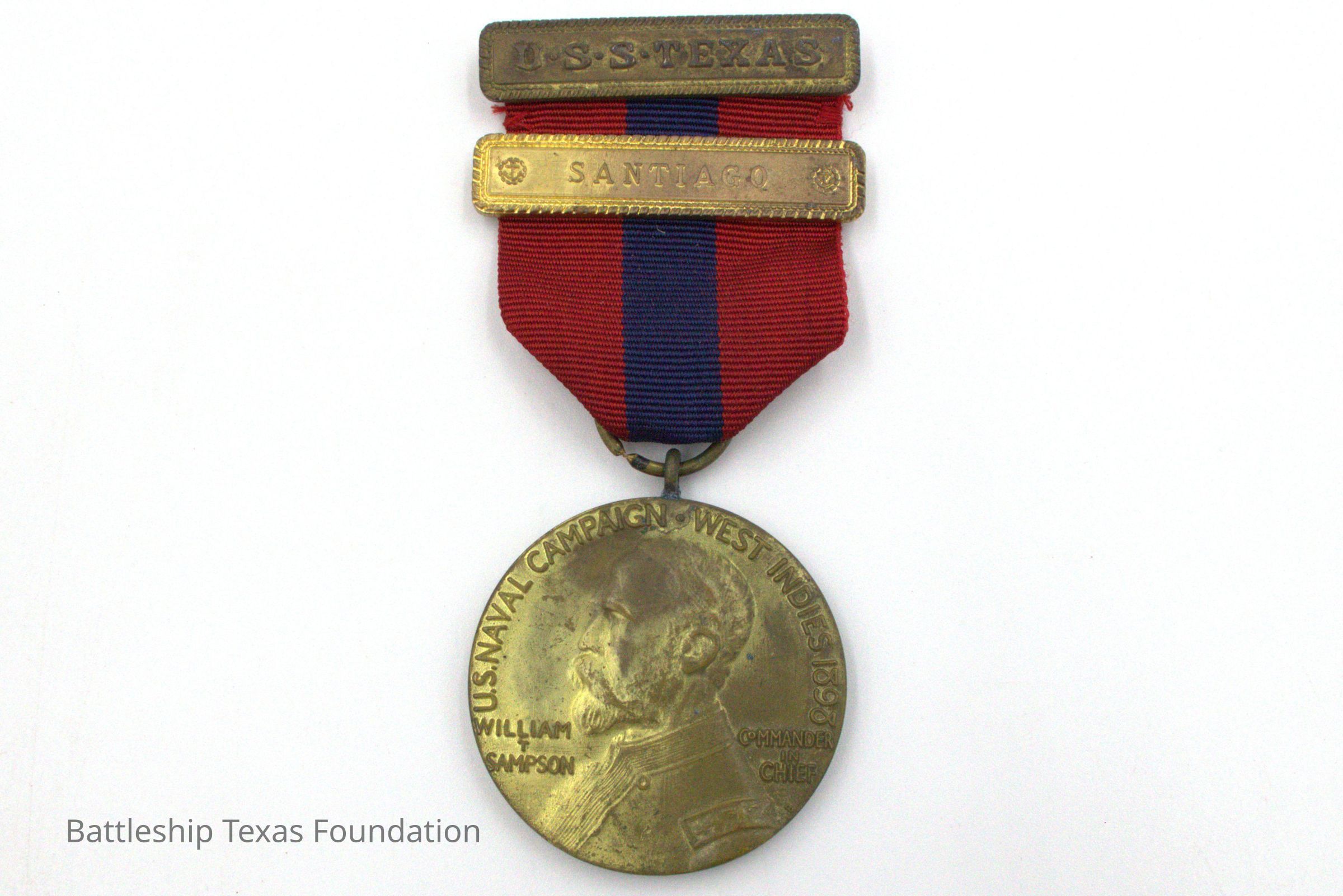 1898 medal for the West Indies campaign during the Spanish American War. Awarded to crewmember of 1895 USS Texas. Santiago medal bar.Context