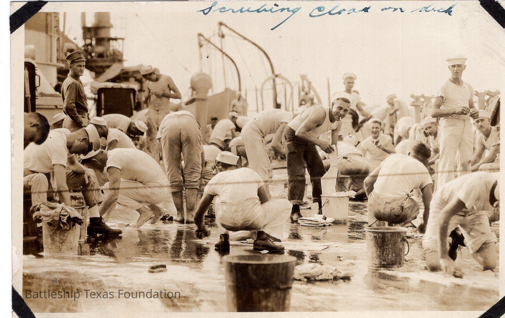 Features over a dozen sailors cleaning the deck of the ship. Crane in background to the right. Photo taken aft of smokestacks on starboard side.Context