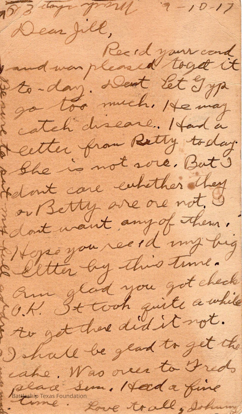 Postcard addressed to Jill and dated to September 10, 1917 (9-10-17)Context
