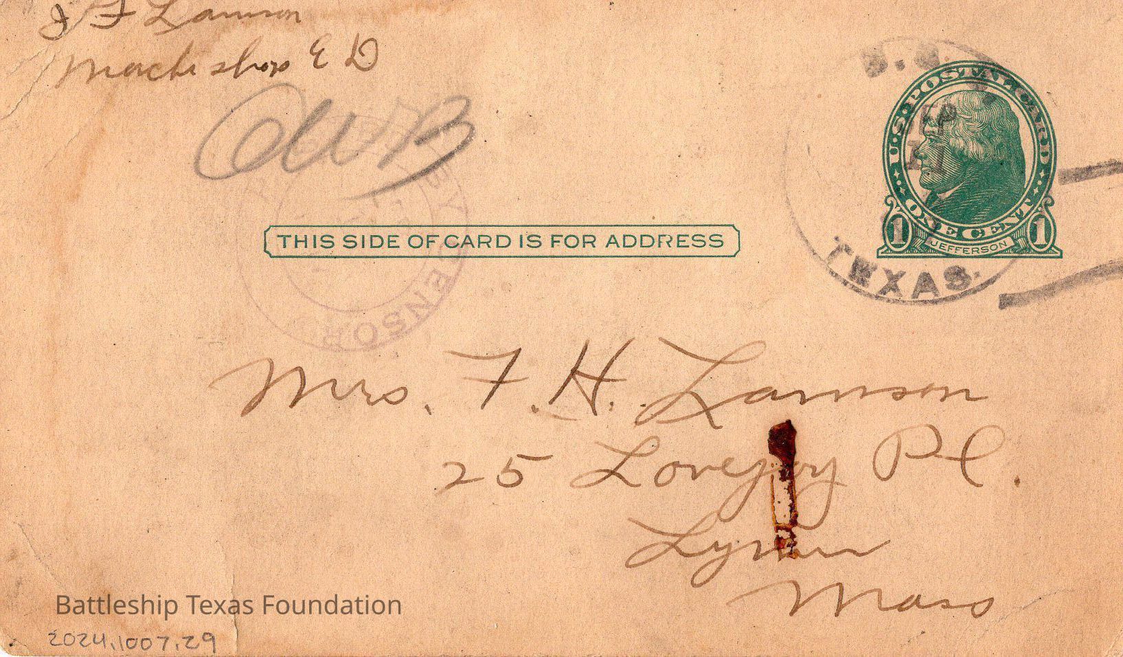 Battleship Texas had her own post office. All mail passed through a censor before leaving the ship. Once the package is checked, it was stamped with a “U.S.S. TEXAS” stamp. If in a port, mail could carry the markers of the post office on shore.Collection