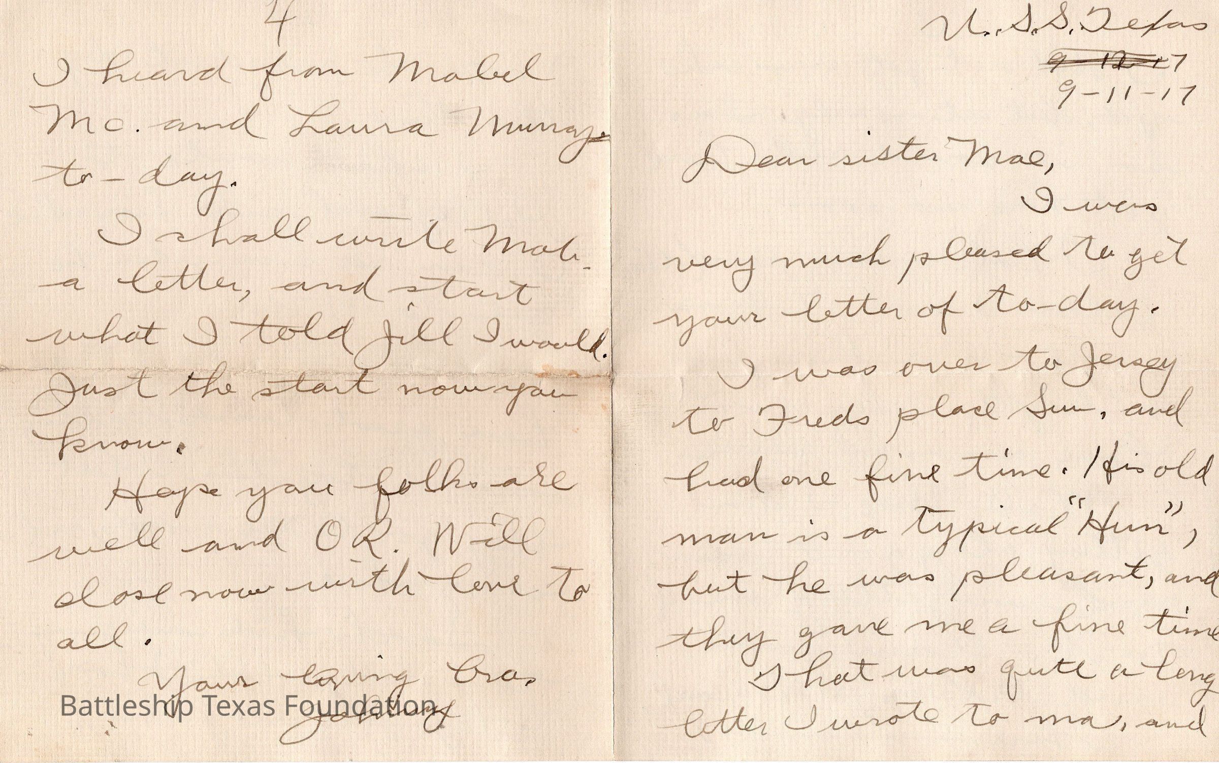 Letter dated to September 11, 1917 (9-11-17) and addressed to Mae.Context