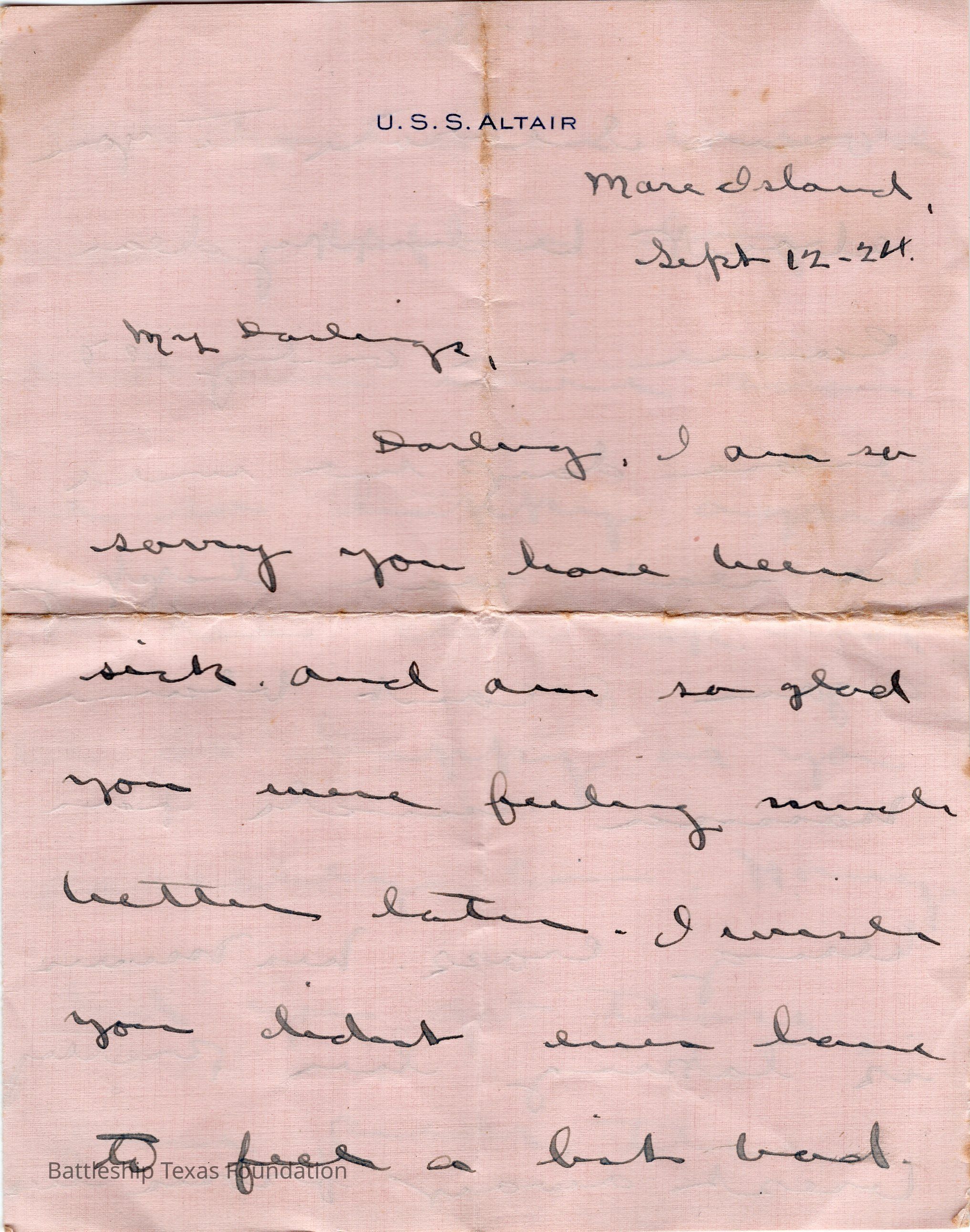 Addressed to his wife from Larry P. Cox. Letter sent from USS Altair on September 12, 1924, when the ship was in Mare Island.Context