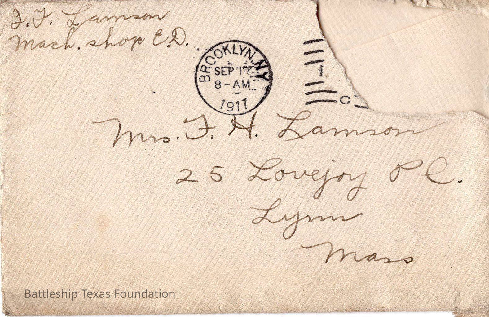 Stamped "BROOKLYN SEP 17 8-AM 1917" and "USS Texas" on the back under writer's name.Context