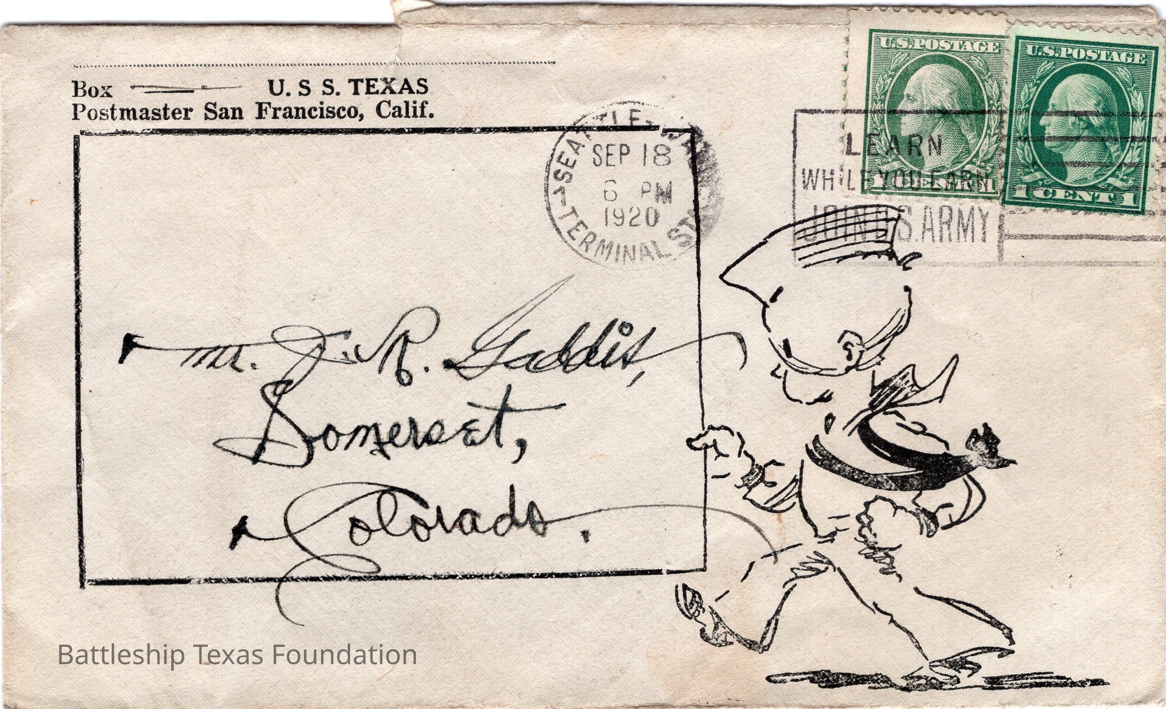 Battleship Texas had her own post office. All mail passed through a censor before leaving the ship. Once the package is checked, it was stamped with a “U.S.S. TEXAS” stamp. If in a port, mail could carry the markers of the post office on shore.Collection