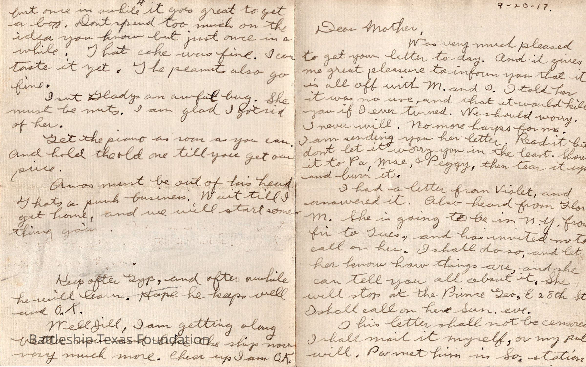Letter dated 9-20-17 and addressed to Mother.Context
