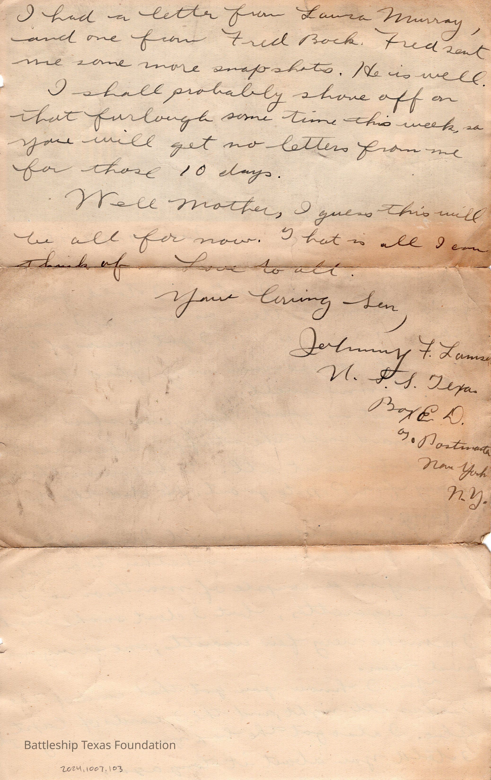 John Lamson was a MM1c on Battleship Texas from May 1917 to June 1919. Throughout his time on Texas, he sent a letter to his family at least once a week, often more. Longer stretches of absence are explained either by movement across the Atlantic, or with the Grand Fleet.