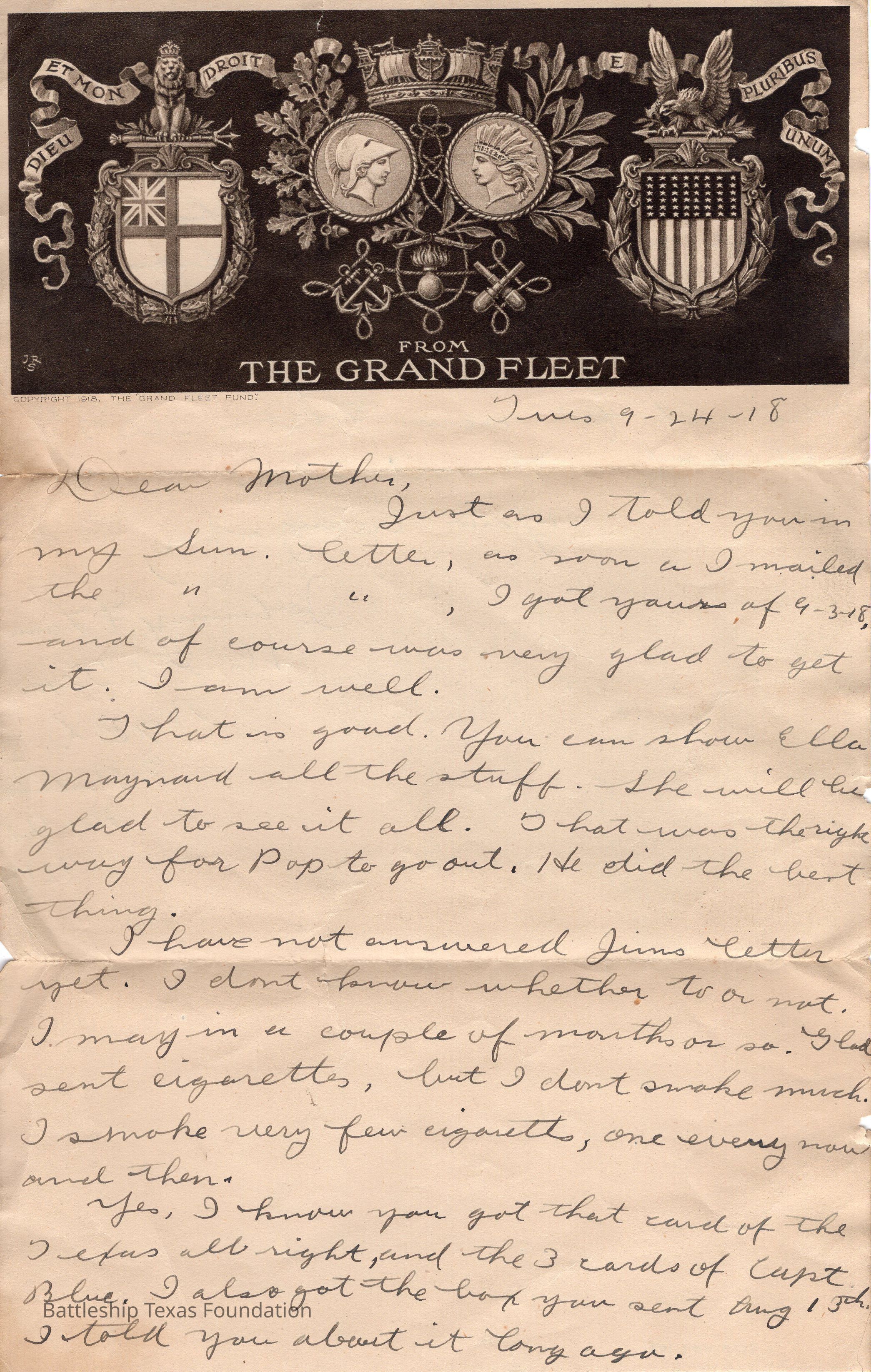 Letter dated Tues 9-24-18 and addressed to Mother. Grand Fleet letterhead with national crests of US and UK.Context