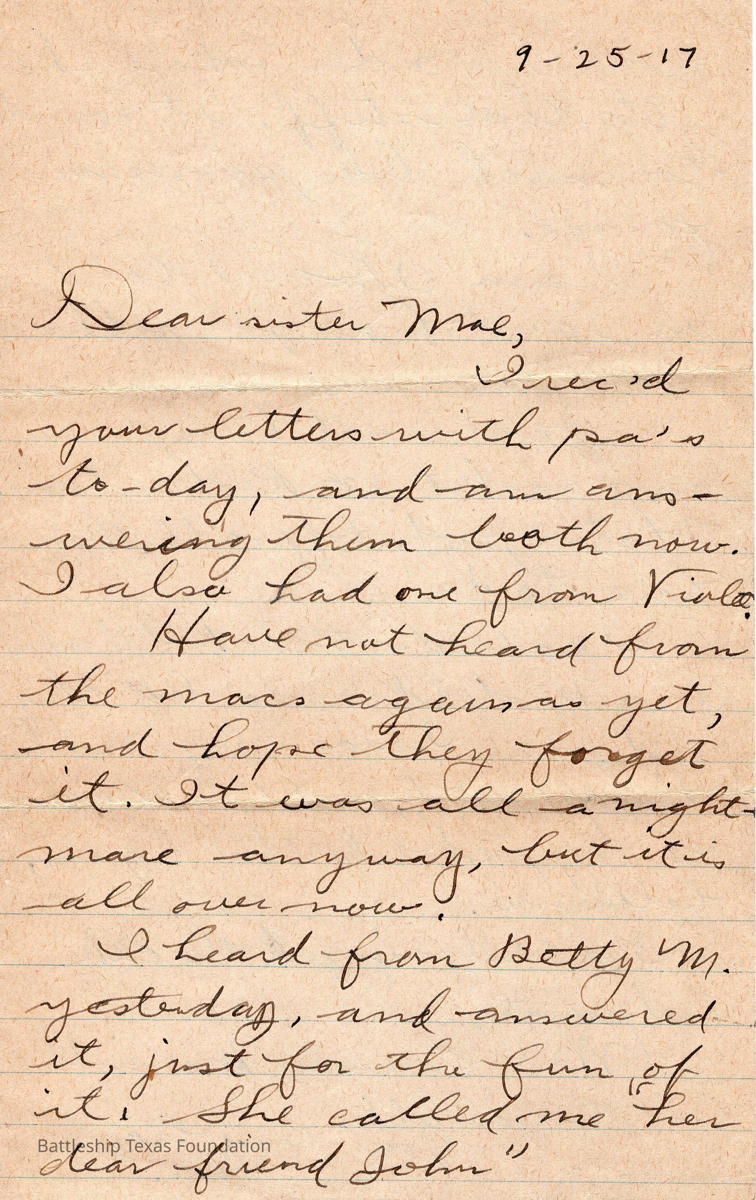 Letter dated to September 25, 1917 (9-25-17) and addressed to sister Mae.Context