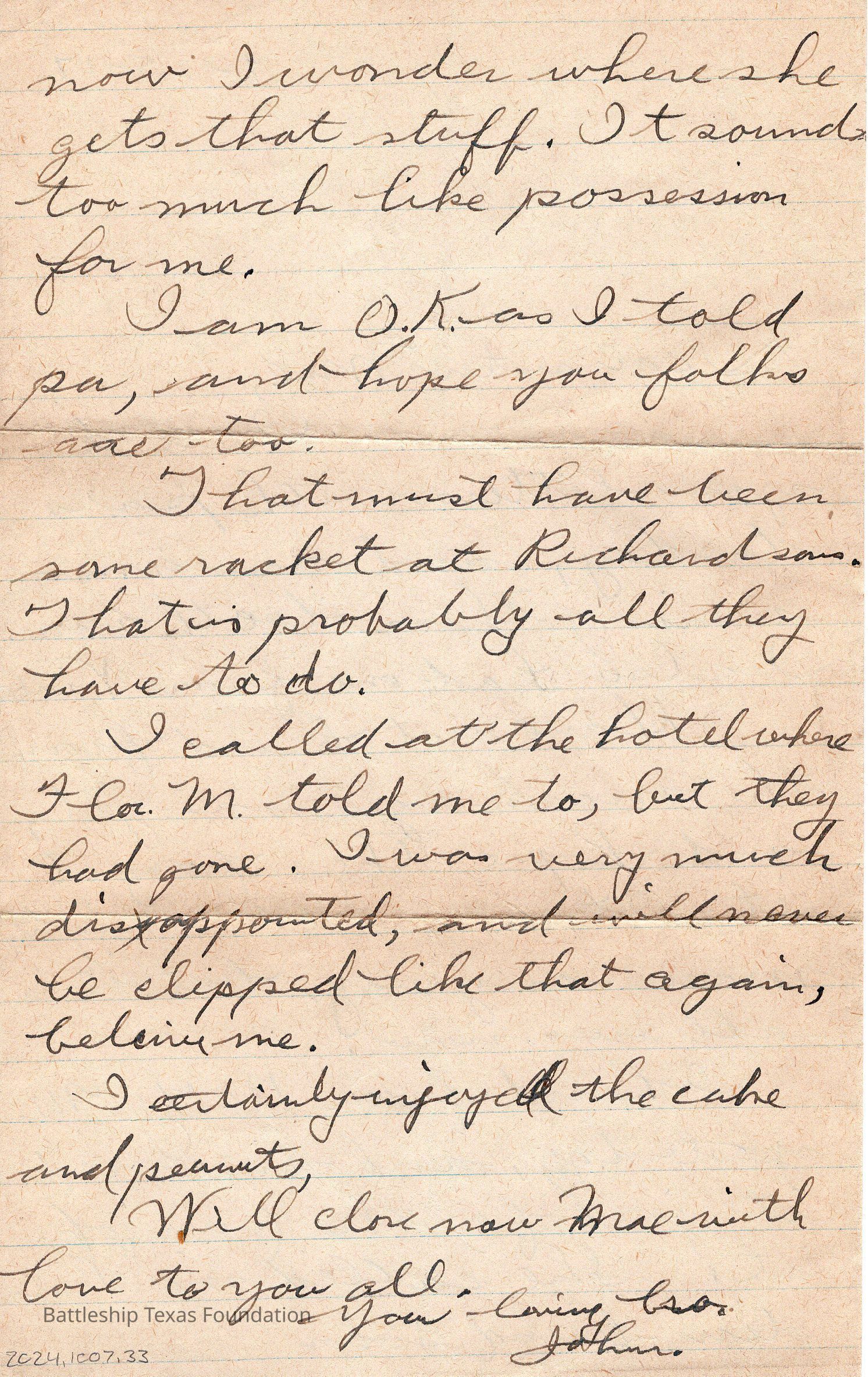 John Lamson was a MM1c on Battleship Texas from May 1917 to June 1919. Throughout his time on Texas, he sent a letter to his family at least once a week, often more. Longer stretches of absence are explained either by movement across the Atlantic, or with the Grand Fleet.