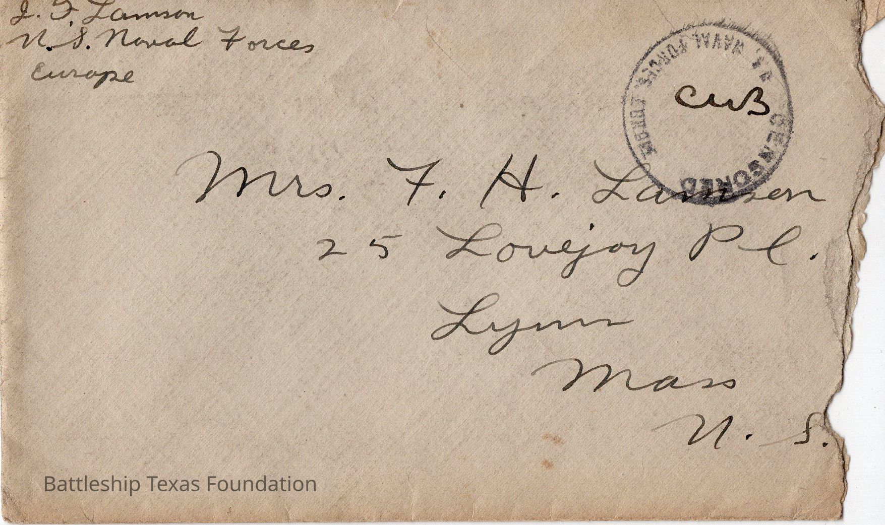 Envelope stamped "CENSORED U.S. NAVAL FORCES. EUROPE" with right end torn off.Context