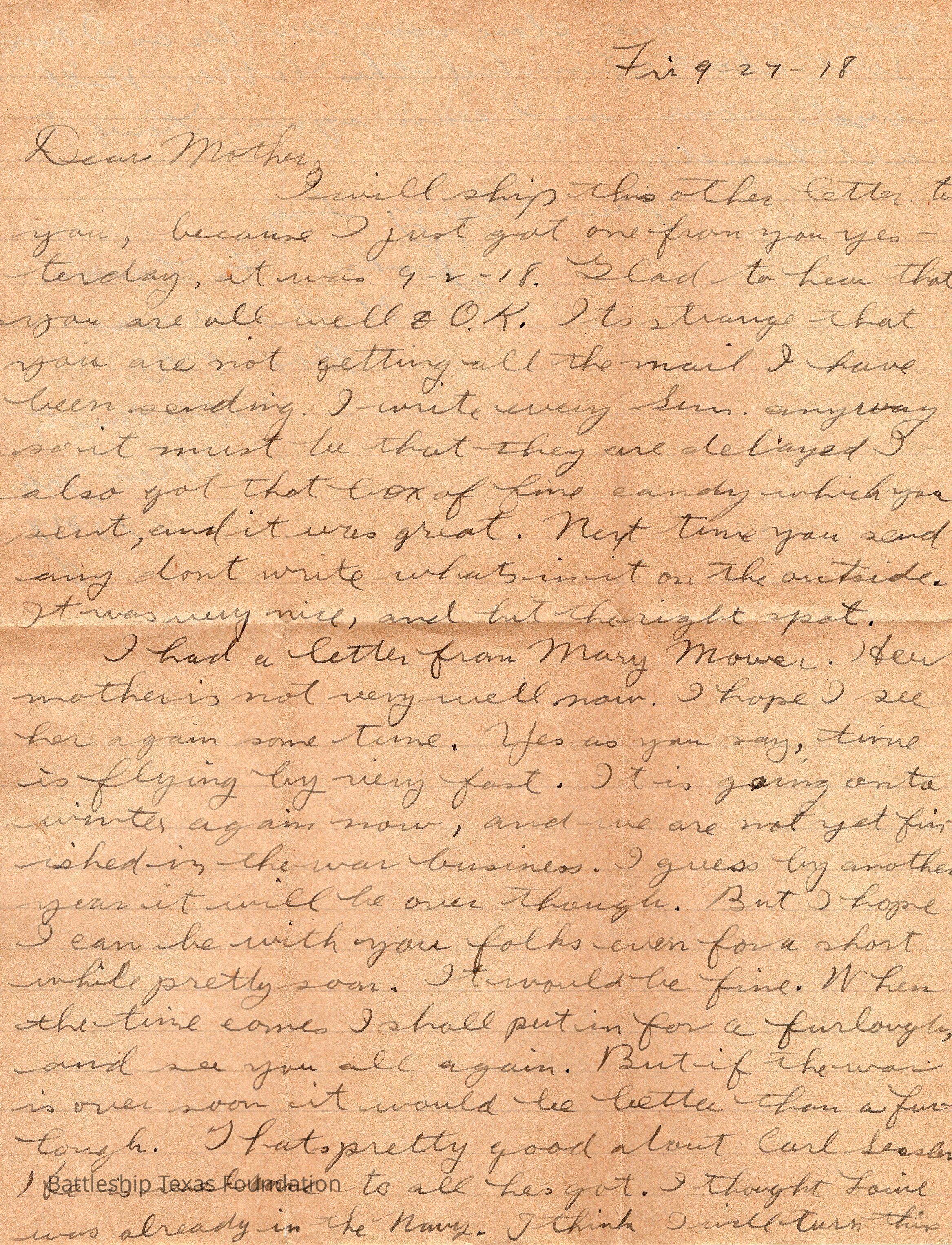 Letter dated Fri 9-27-18 and addressed to Mother.Context