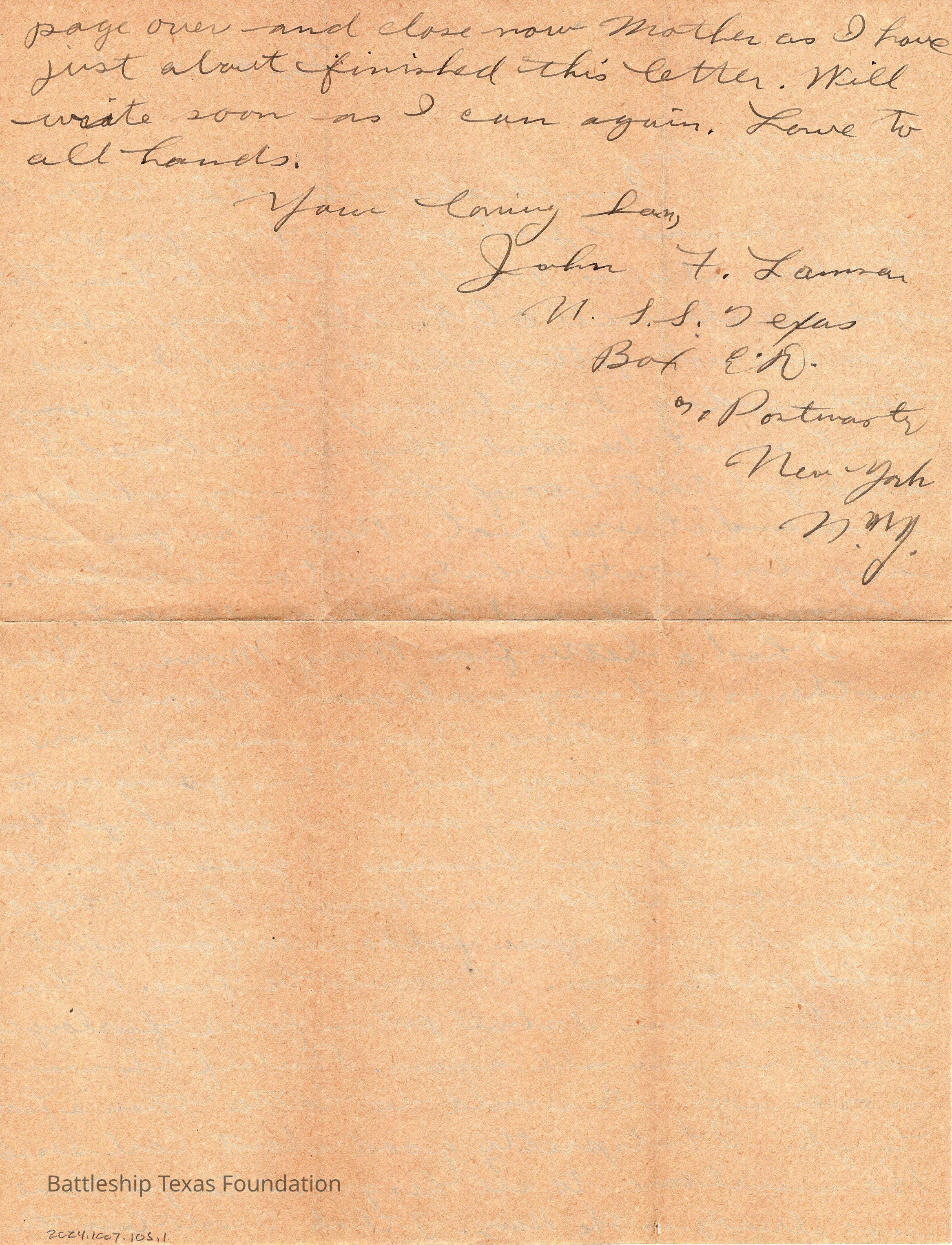 John Lamson was a MM1c on Battleship Texas from May 1917 to June 1919. Throughout his time on Texas, he sent a letter to his family at least once a week, often more. Longer stretches of absence are explained either by movement across the Atlantic, or with the Grand Fleet.