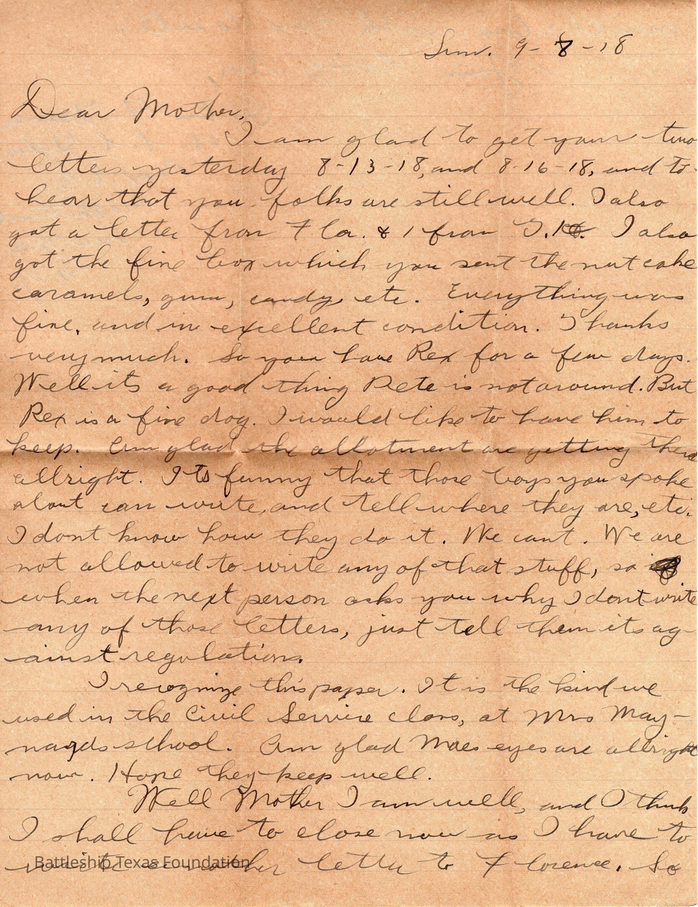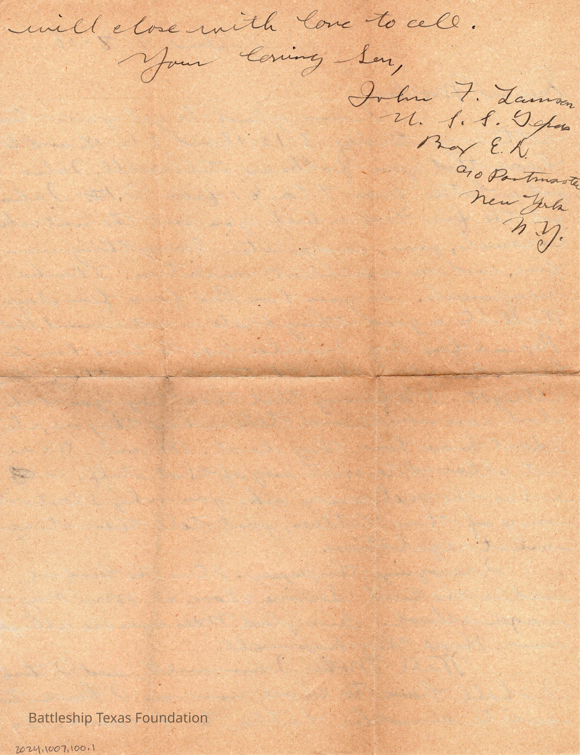John Lamson was a MM1c on Battleship Texas from May 1917 to June 1919. Throughout his time on Texas, he sent a letter to his family at least once a week, often more. Longer stretches of absence are explained either by movement across the Atlantic, or with the Grand Fleet.