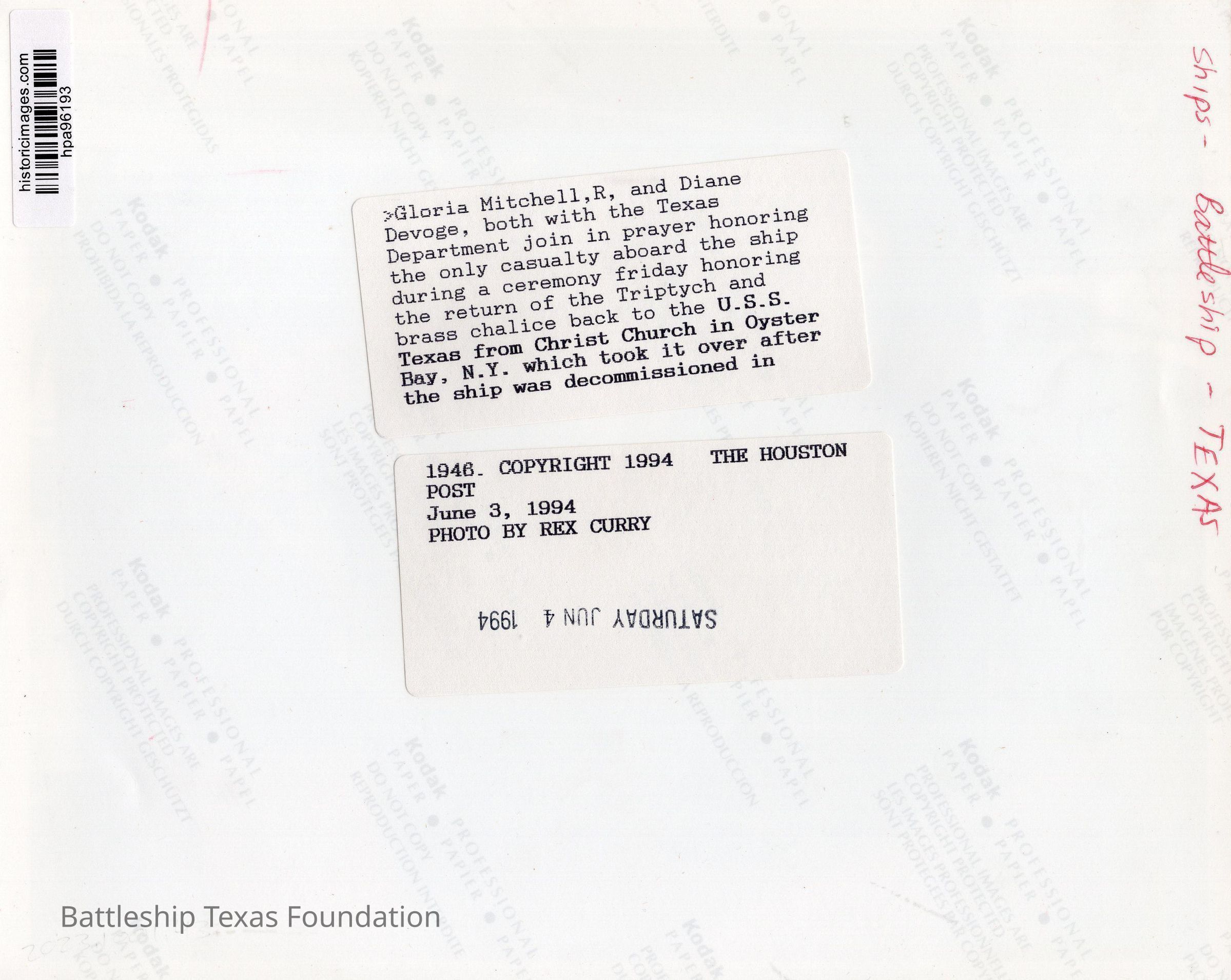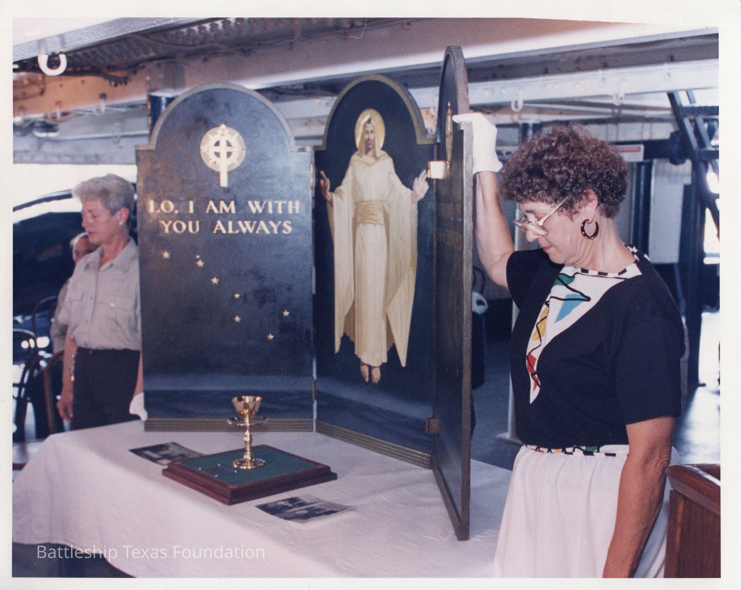 Two women standing on either side of an alter. Triptych reads "LO I AM WITH YOU ALWAYS" with a depiction of Jesus. Dates to June 3, 1994. Back reads Gloria Mitchelle,R, and Diane Devoge, both with the Texas Department join in prayer honoring the only casualty..."Context