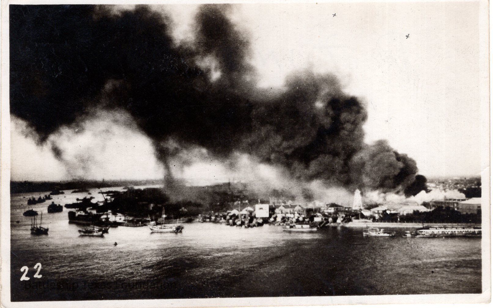 Features river curving behind landmass with mass of smoke rising from right of photo over the center billowing to the left. Back has writing "Pootung Point"Context