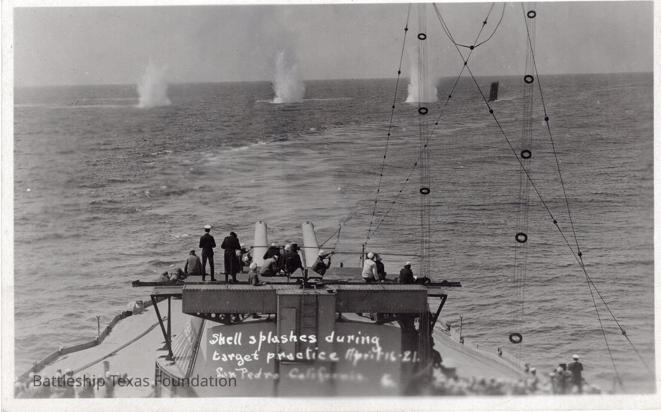 "Shell splashes during target practice April 16-21. San Pedro California."Context