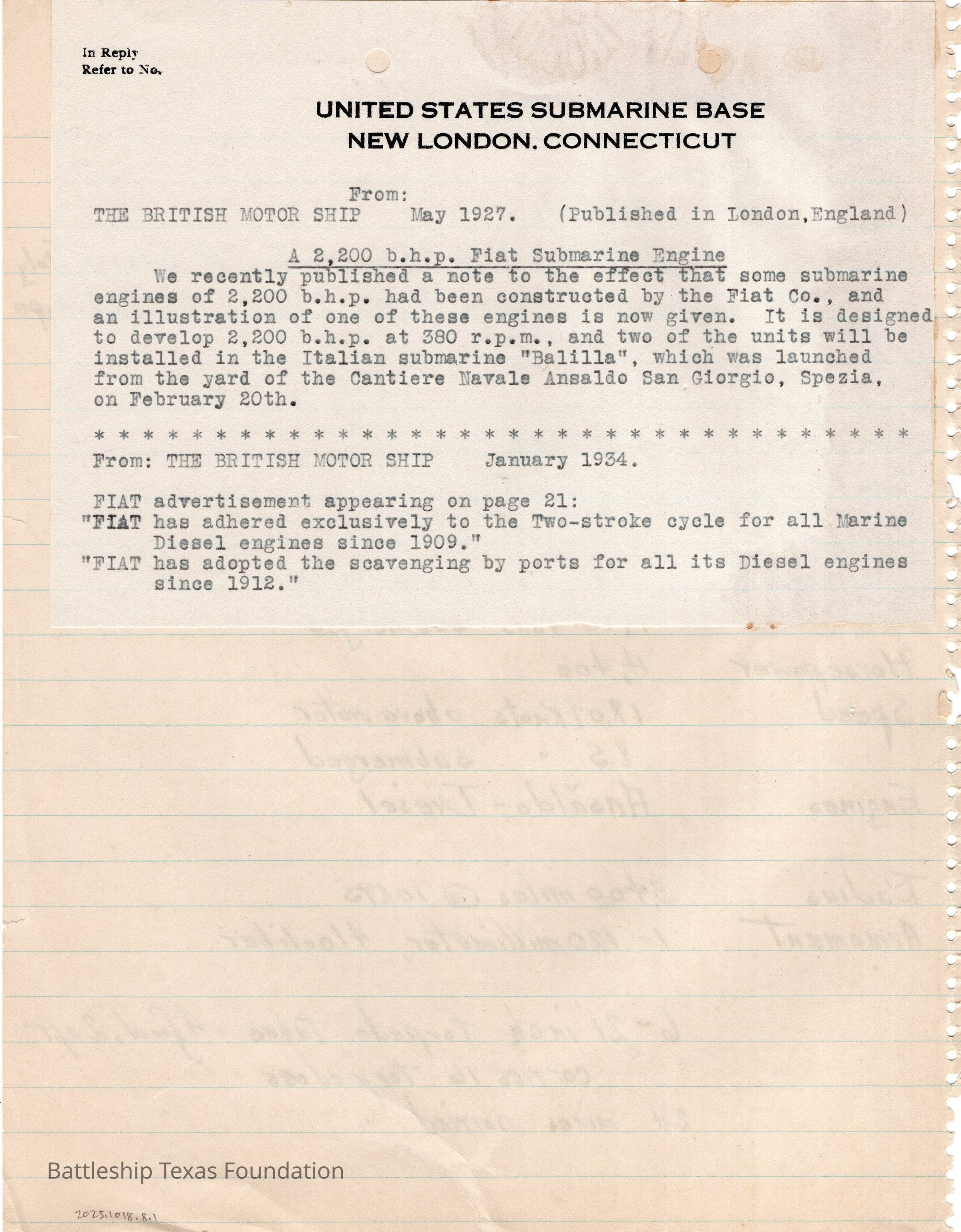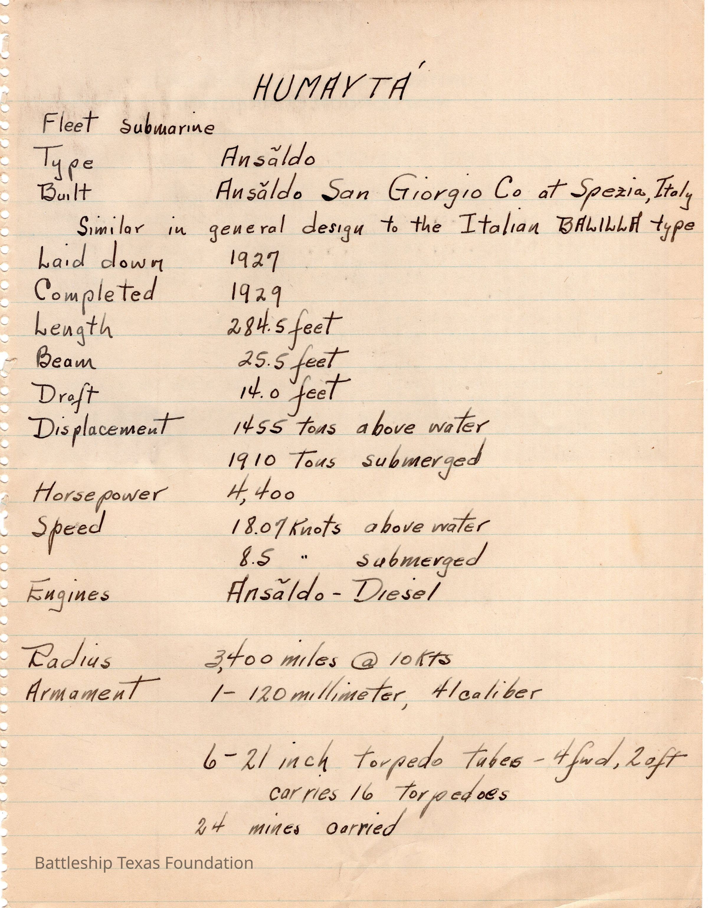 Notes headed with "HUMAYTA" and details construction in 1927, and the ship's specifications. Back has printed memo from New London.Context
