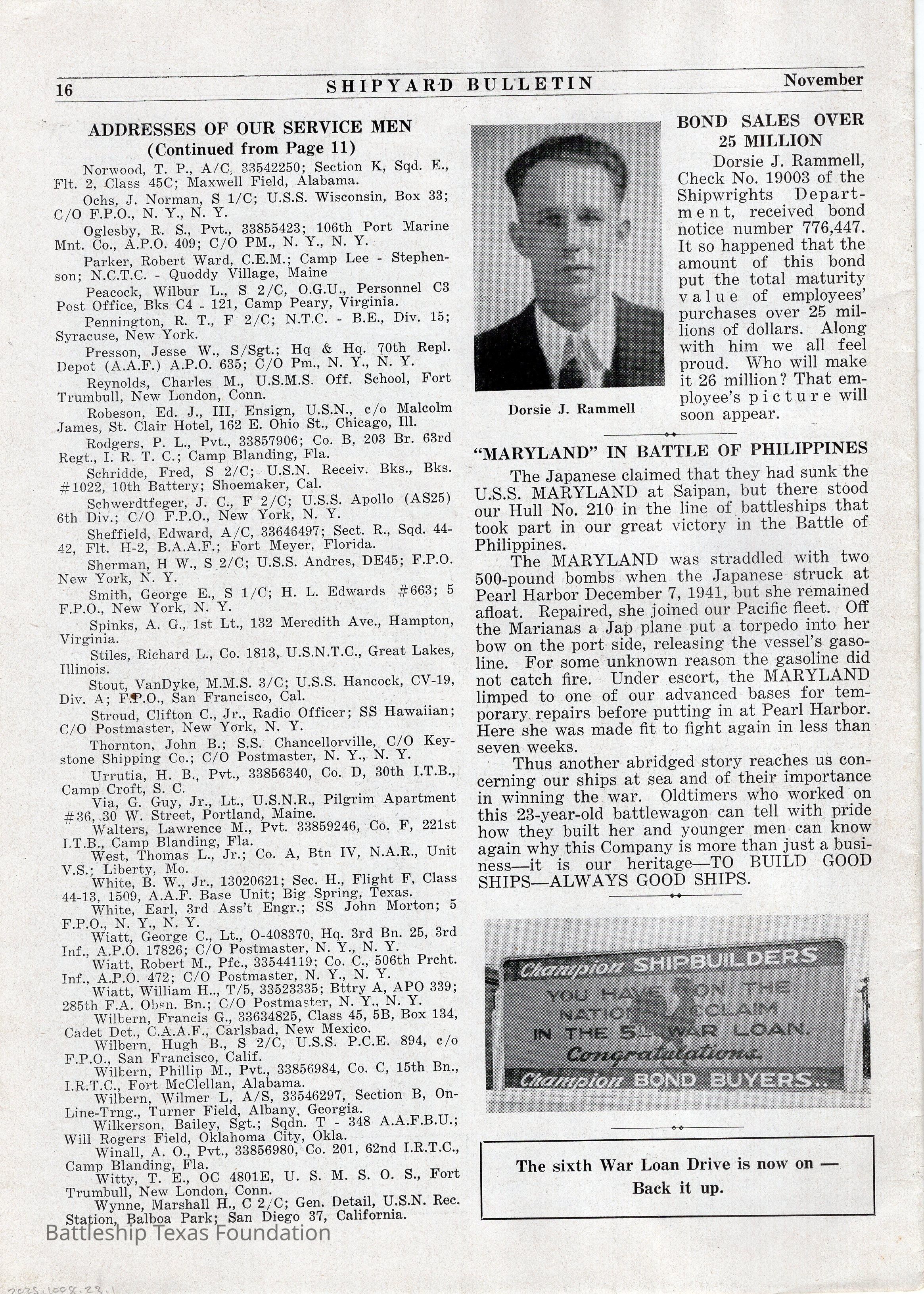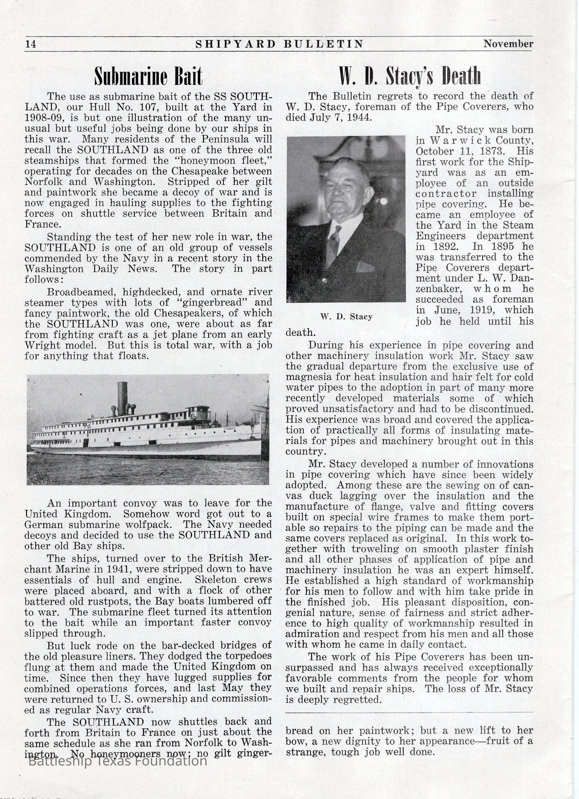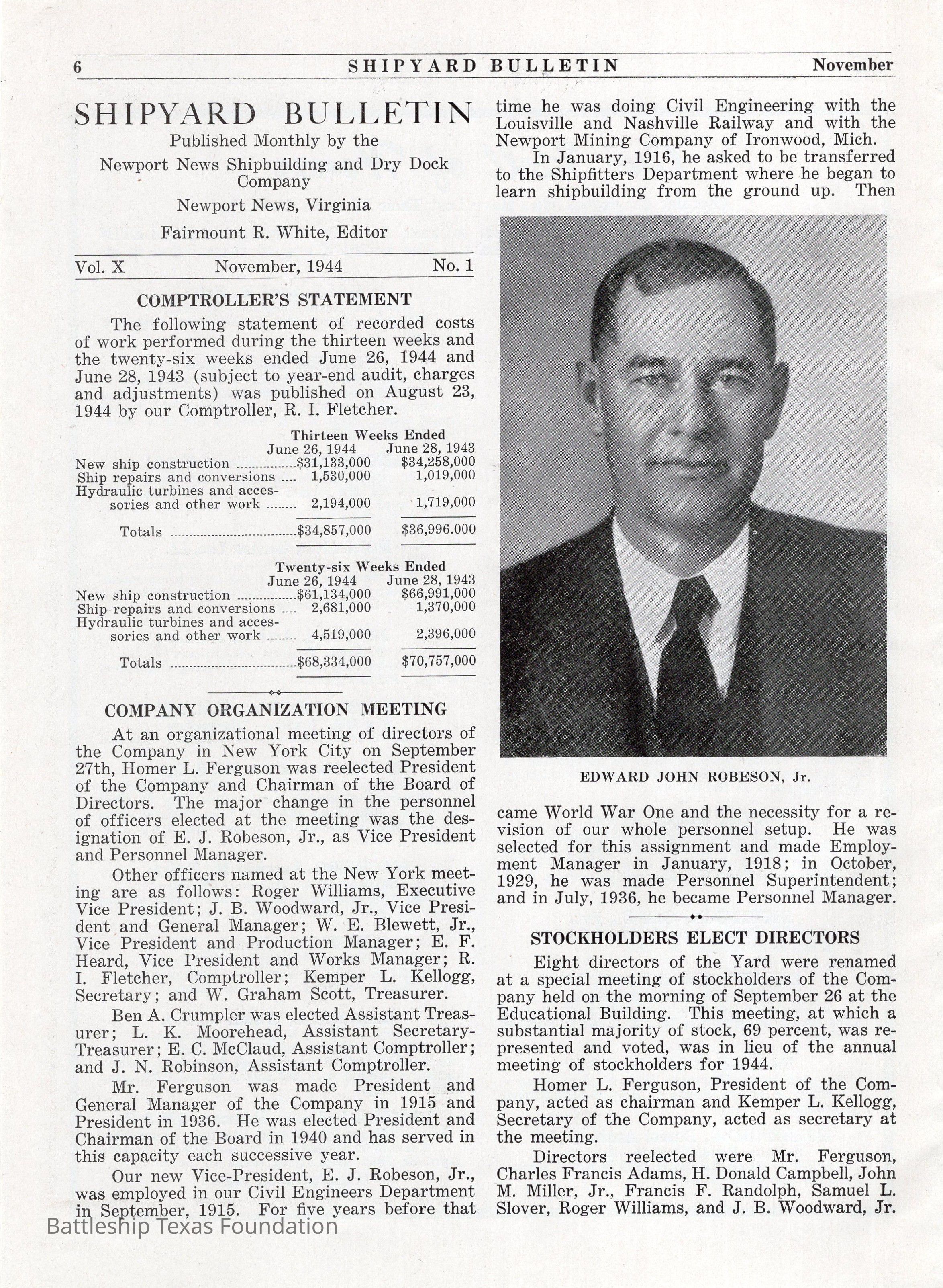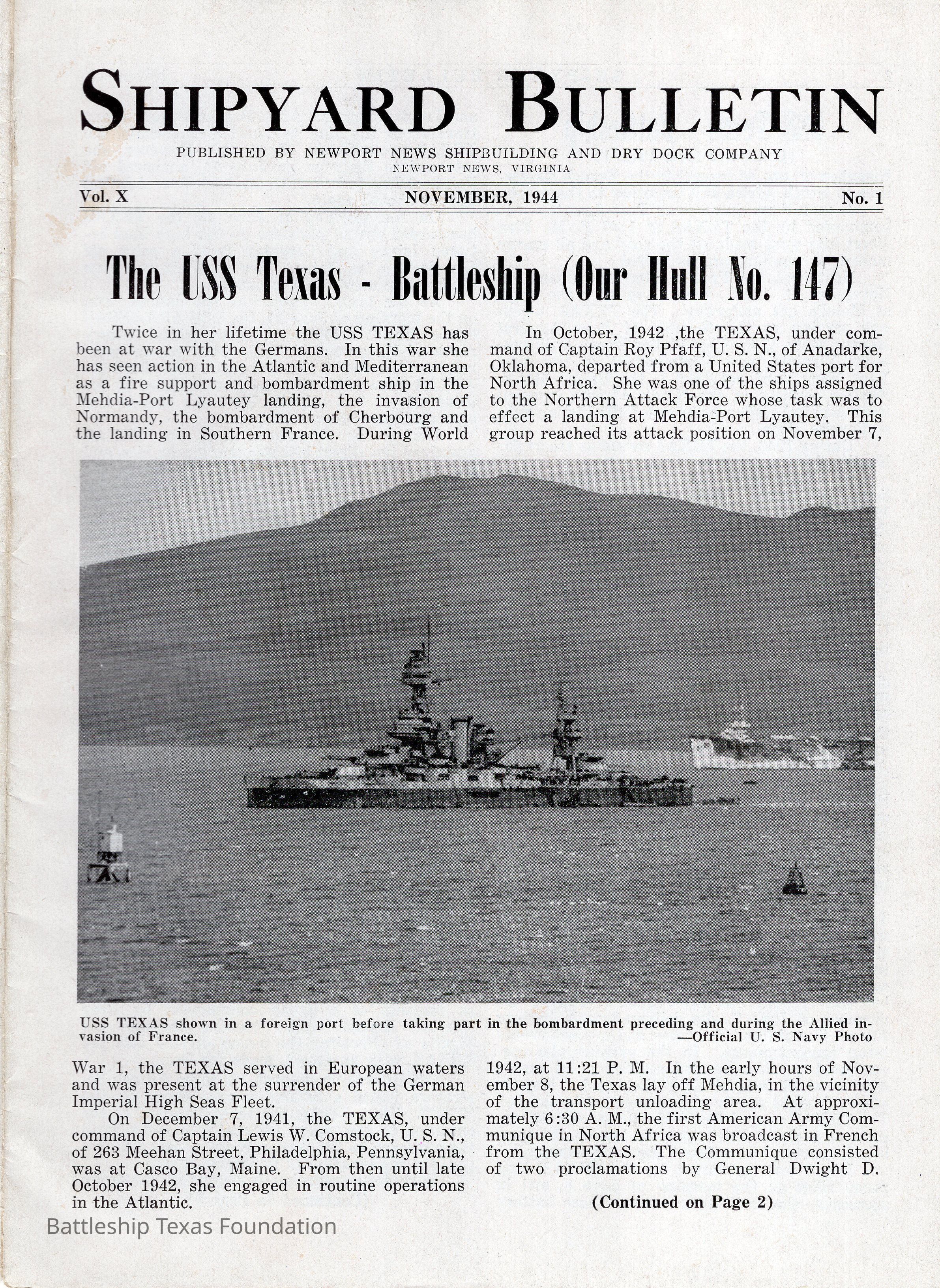 Shipyard Bulletin Volume 10, Number 1, published in November 1944 by Newport News Shipbuilding and Dry Dock Company in Newport News, Virginia. Magazine is 16 pages long, consisting of four sheets layered over one another. The magazine was donated together, but the bonding agent has degraded, separating each of the four sheets.