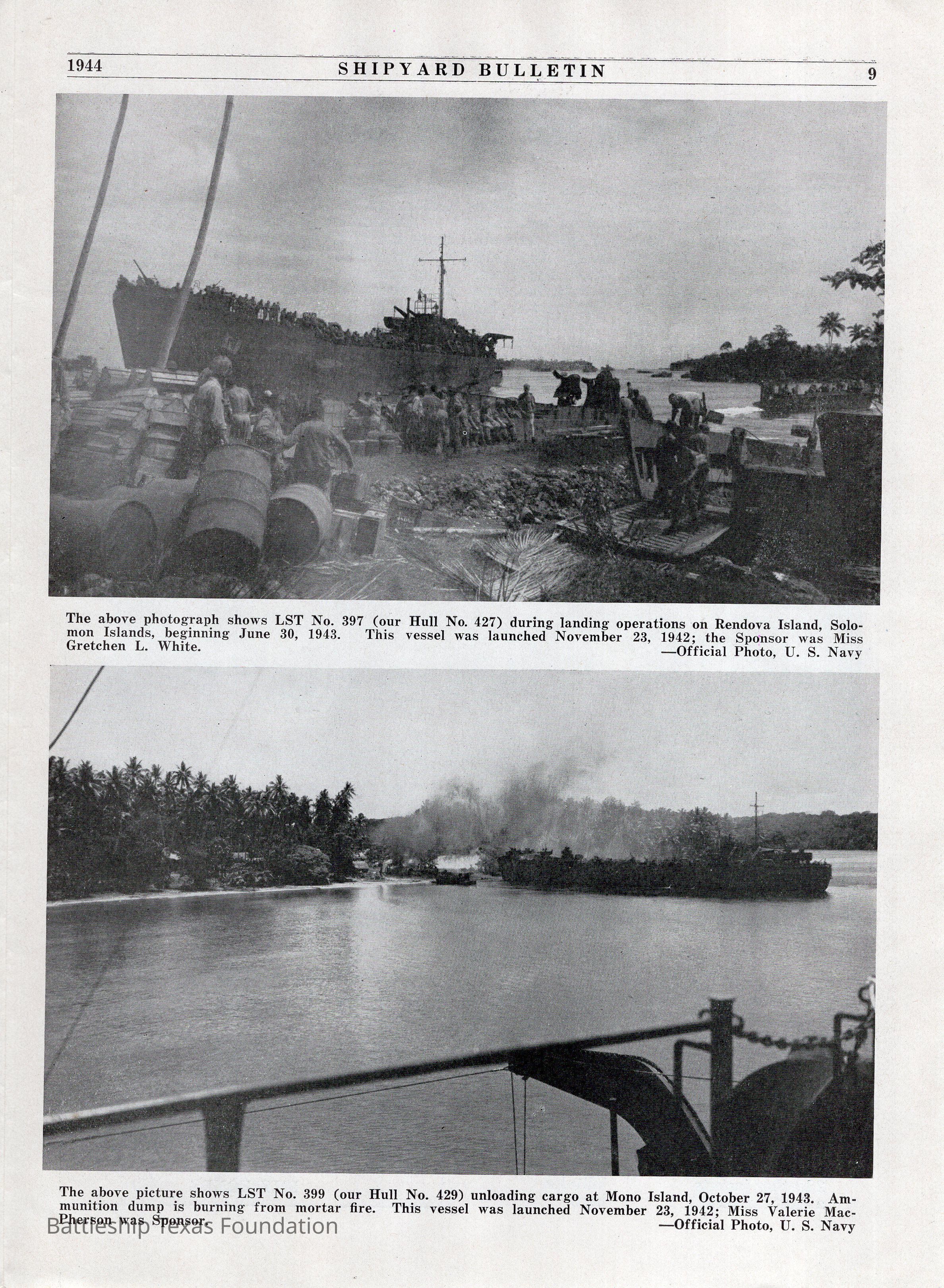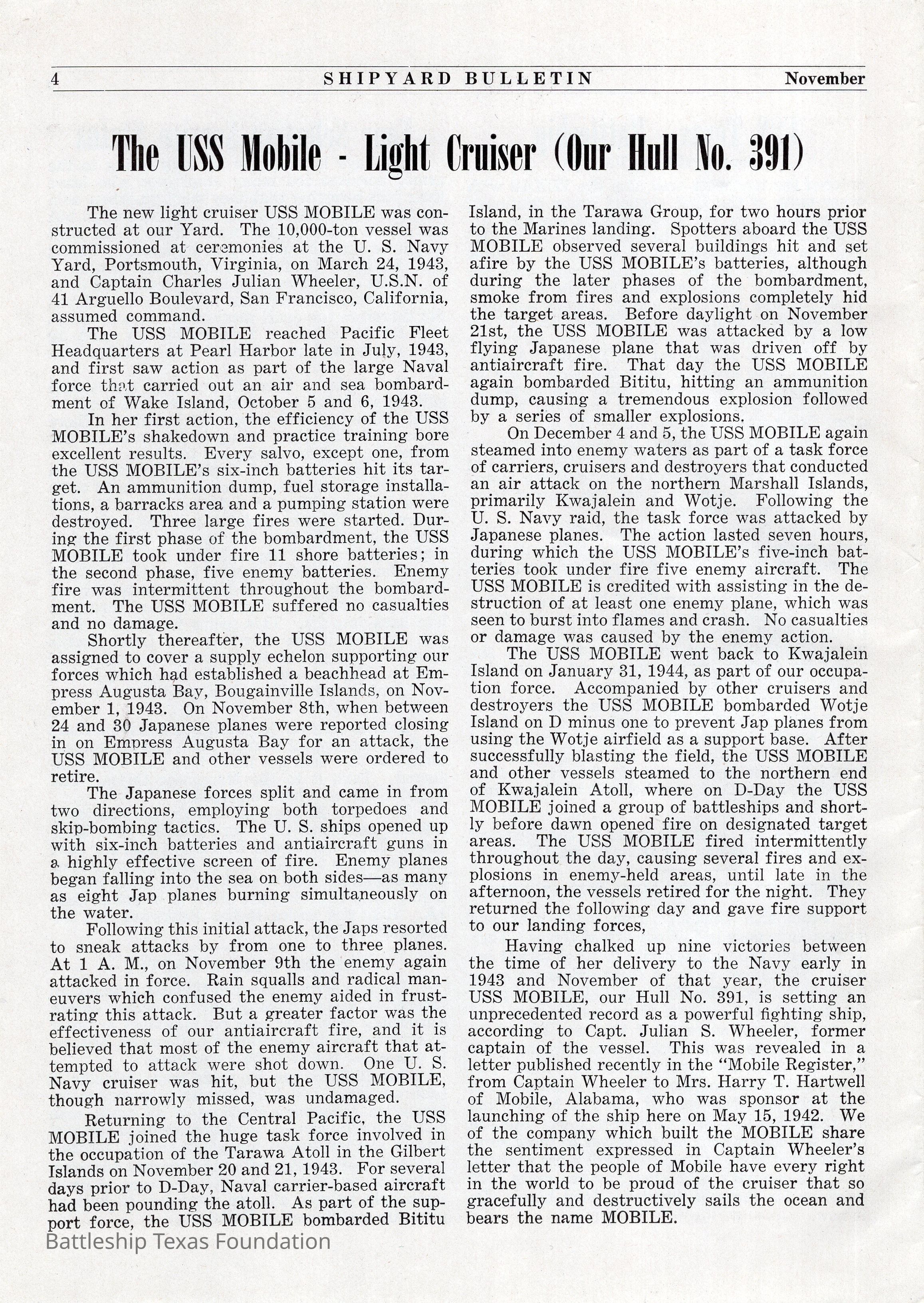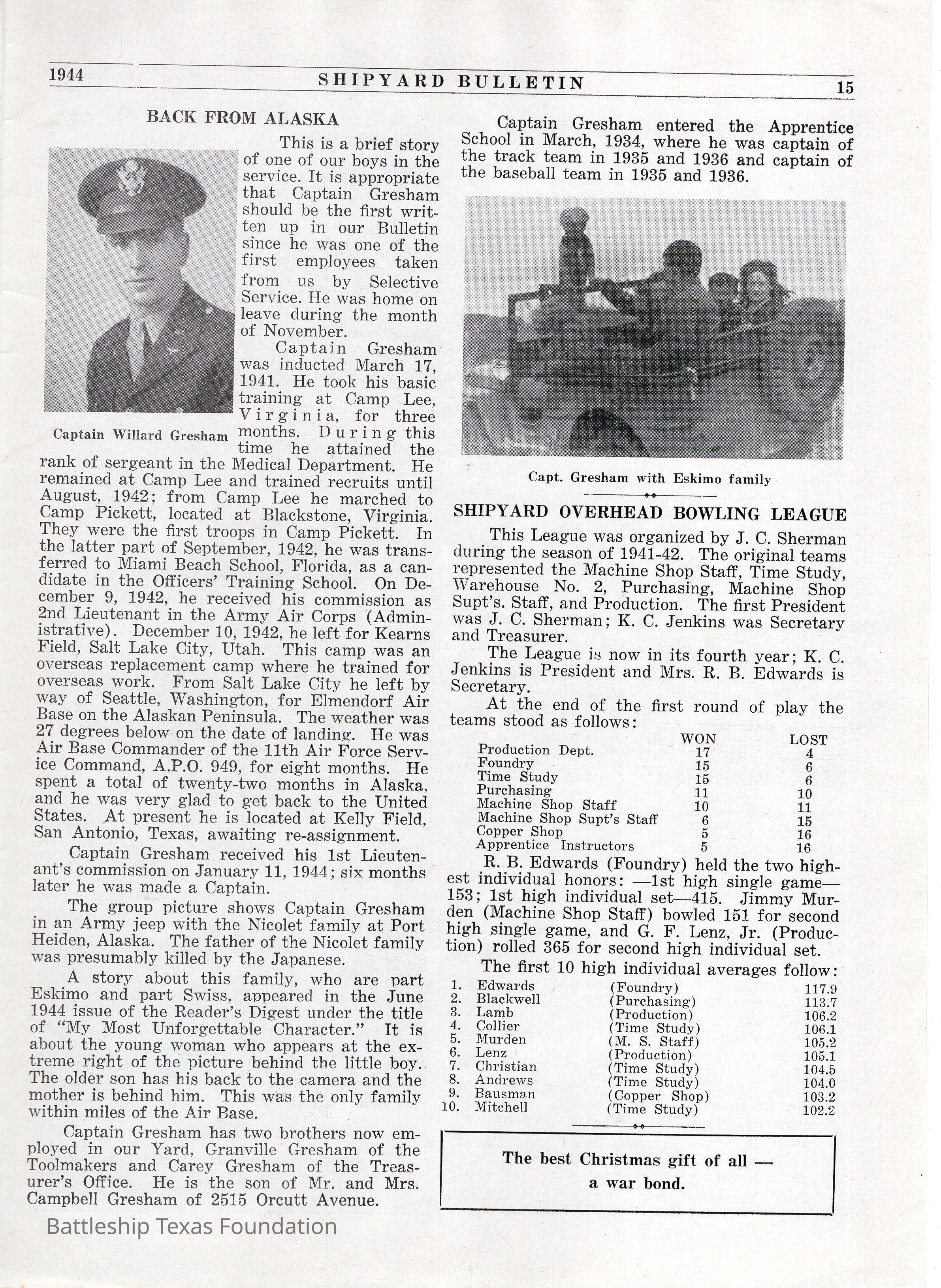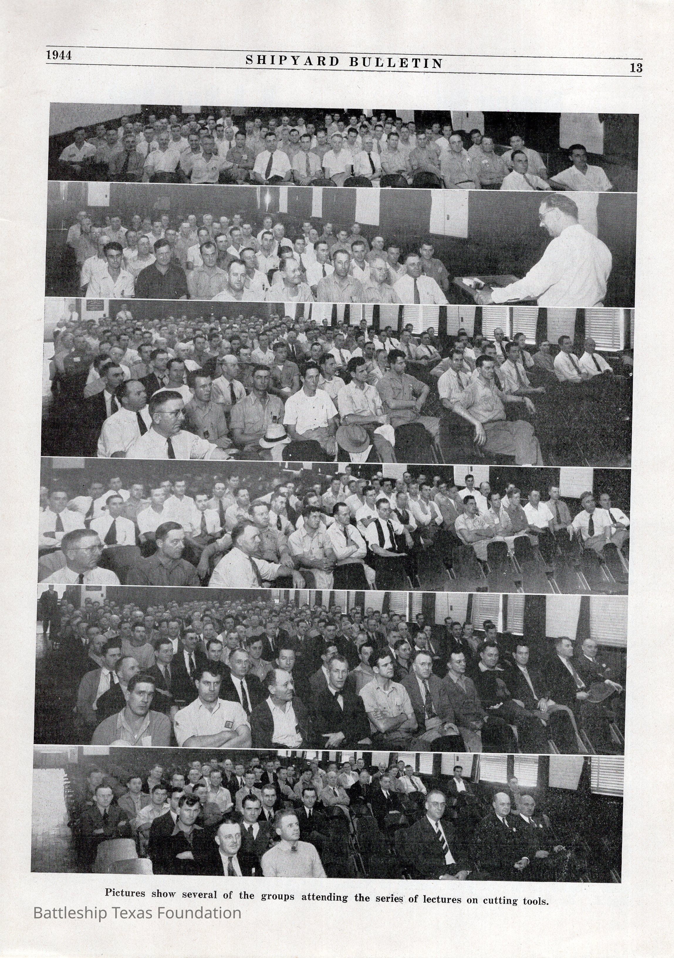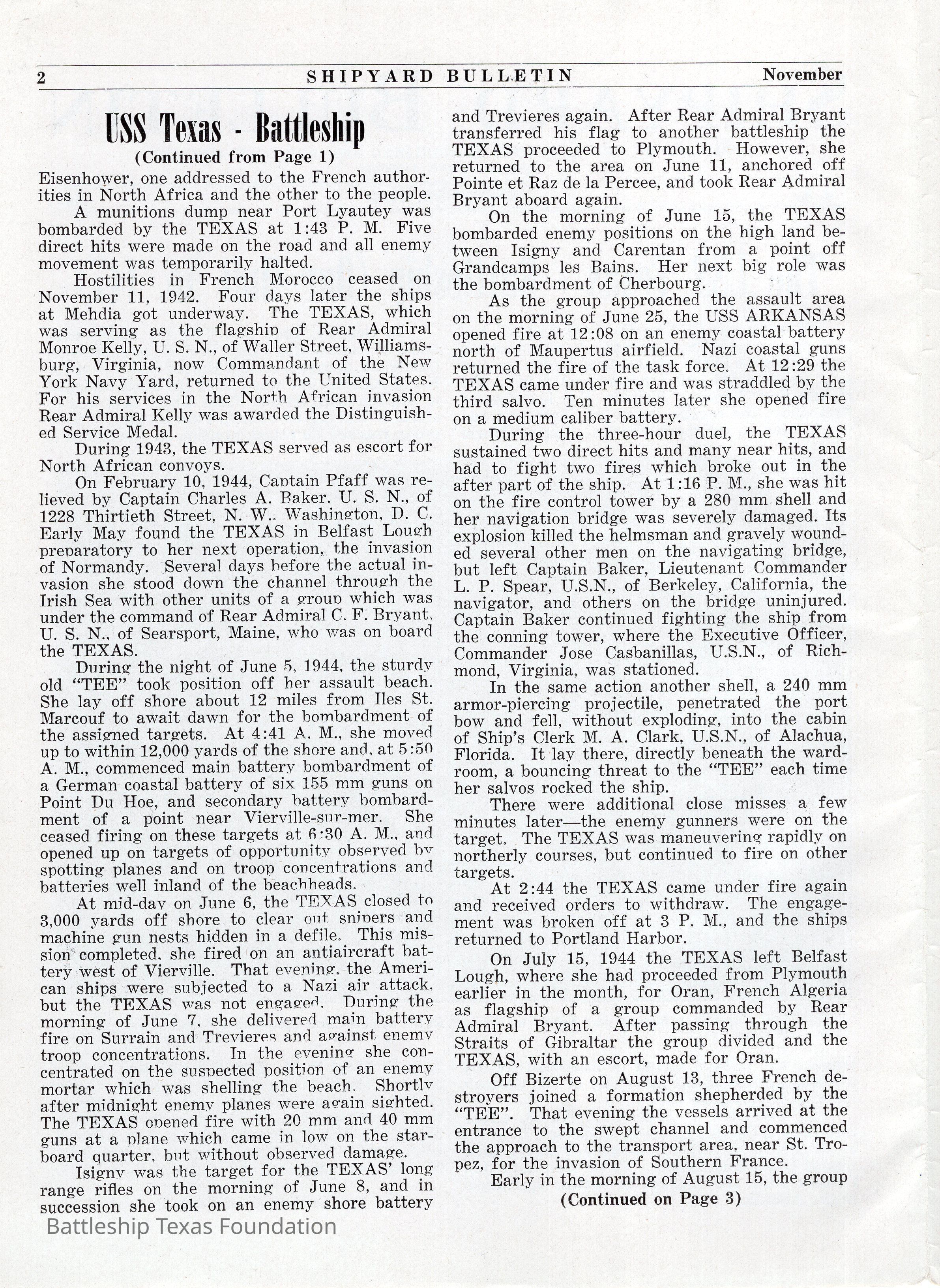 Shipyard Bulletin Volume 10, Number 1, published in November 1944 by Newport News Shipbuilding and Dry Dock Company in Newport News, Virginia. Magazine is 16 pages long, consisting of four sheets layered over one another. The magazine was donated together, but the bonding agent has degraded, separating each of the four sheets.