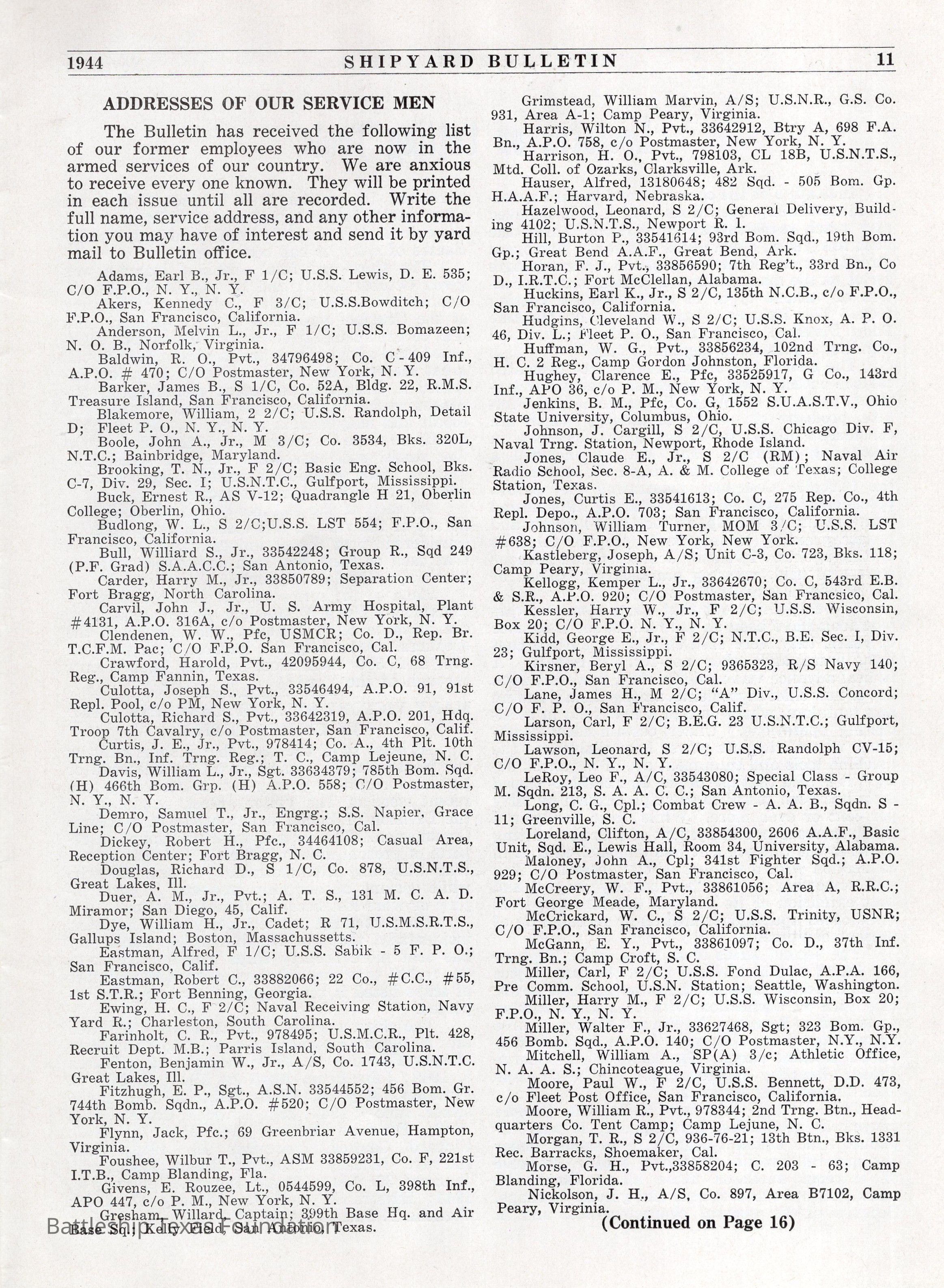 Shipyard Bulletin Volume 10, Number 1, published in November 1944 by Newport News Shipbuilding and Dry Dock Company in Newport News, Virginia. Magazine is 16 pages long, consisting of four sheets layered over one another. The magazine was donated together, but the bonding agent has degraded, separating each of the four sheets.