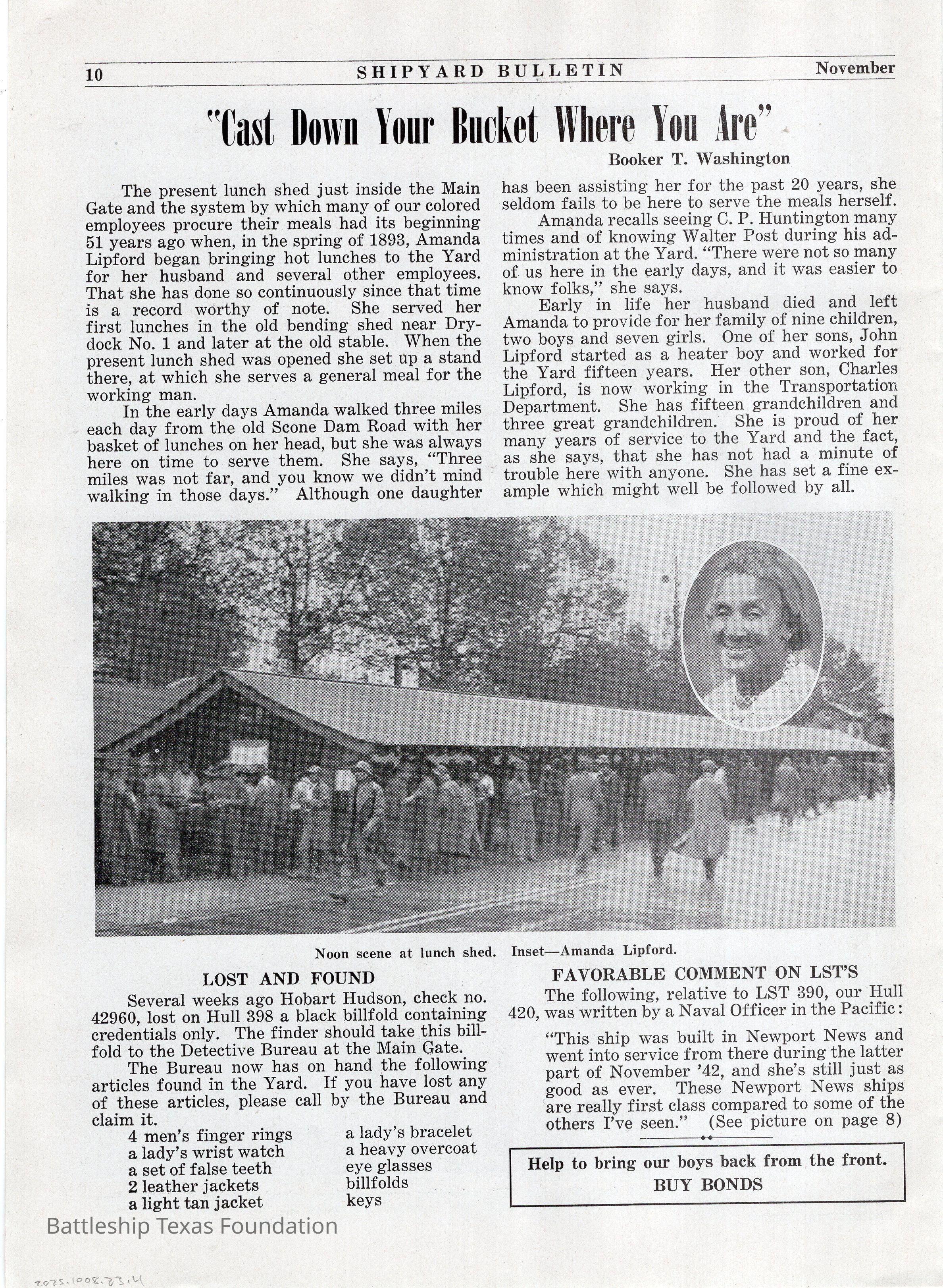 Shipyard Bulletin Volume 10, Number 1, published in November 1944 by Newport News Shipbuilding and Dry Dock Company in Newport News, Virginia. Magazine is 16 pages long, consisting of four sheets layered over one another. The magazine was donated together, but the bonding agent has degraded, separating each of the four sheets.