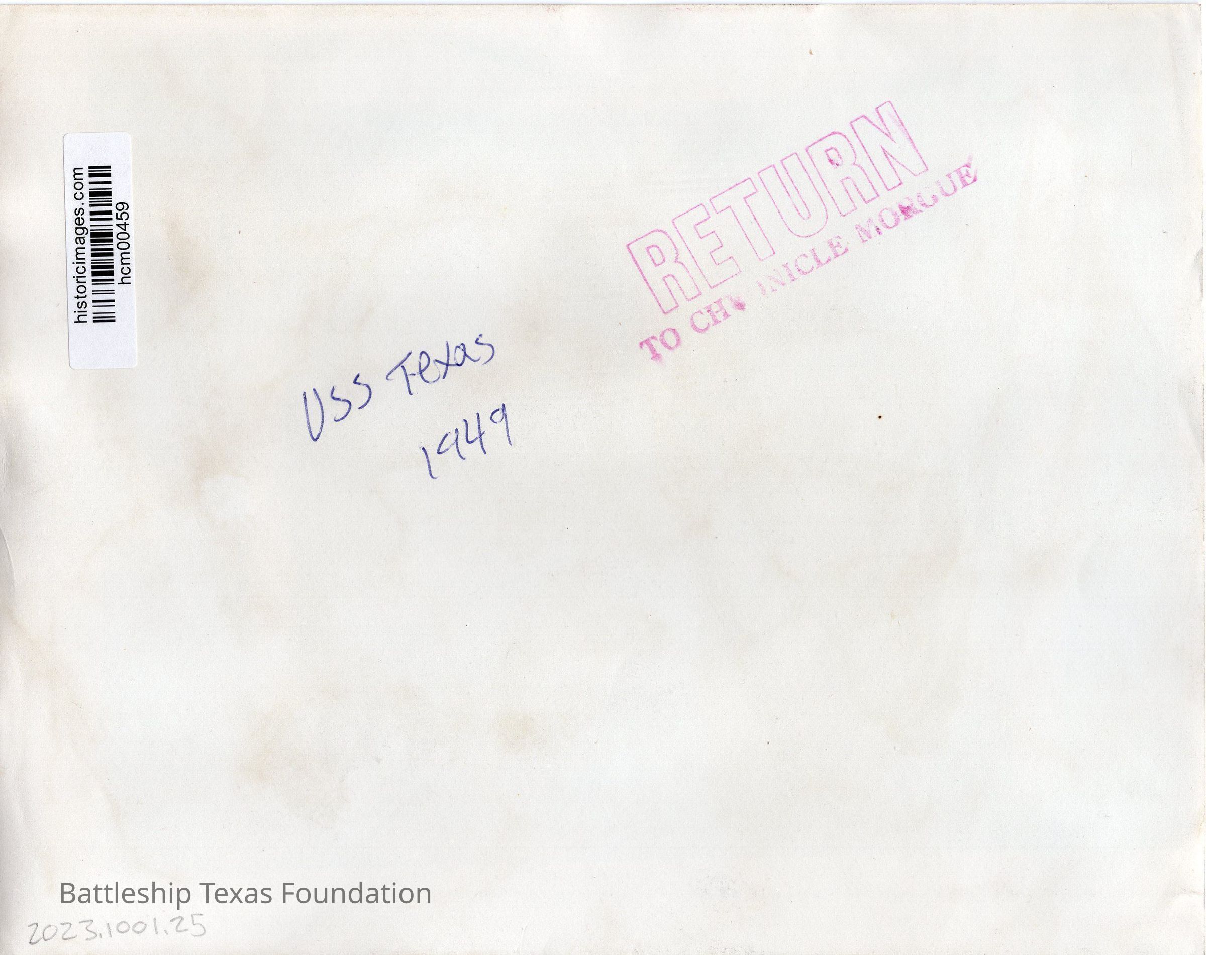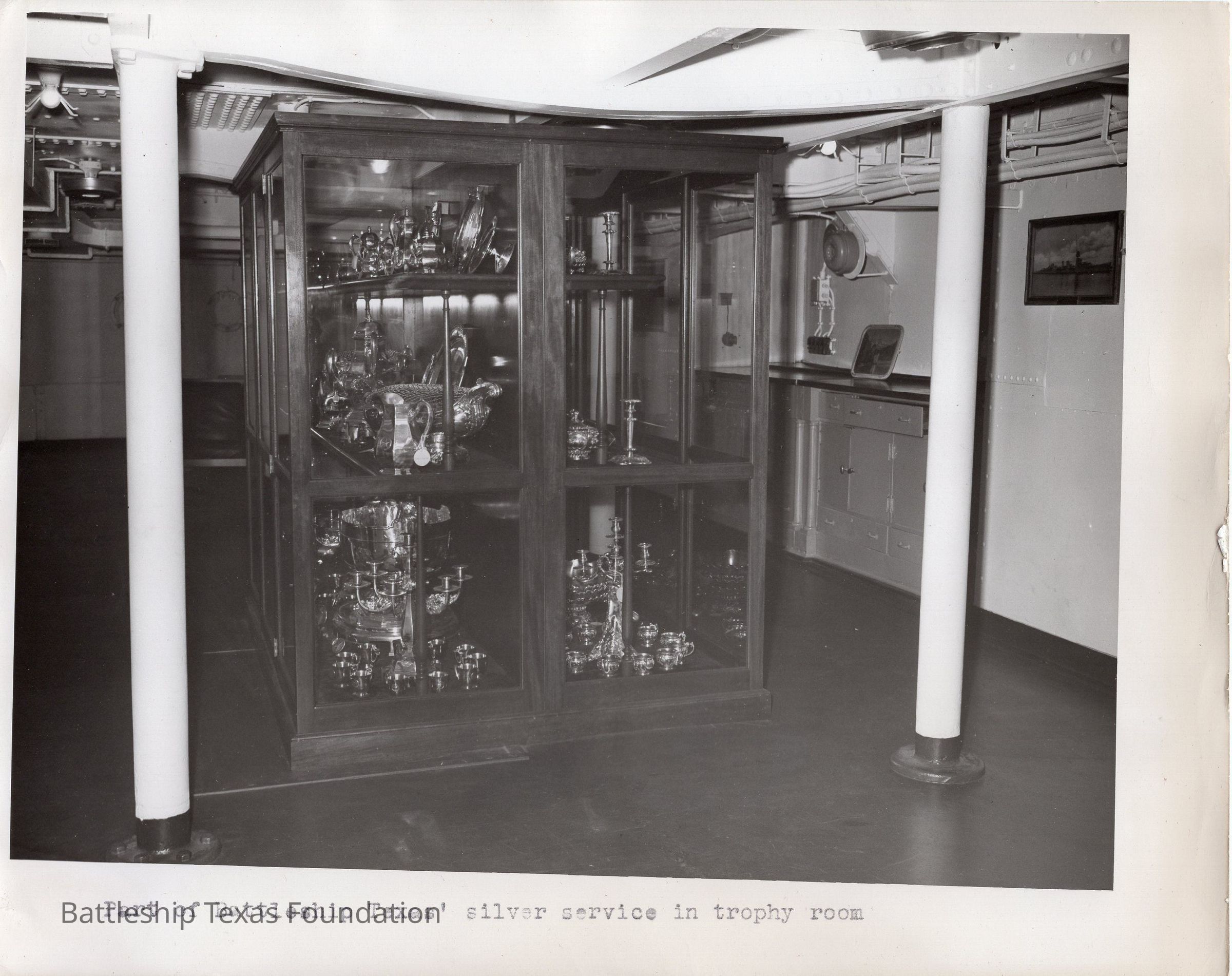 1949 photo of the silver case in center of the ward room. Bottom text: "Part of Battleship Texas' silver service in trophy room" and back says "USS Texas 1949" in blue ink.Context