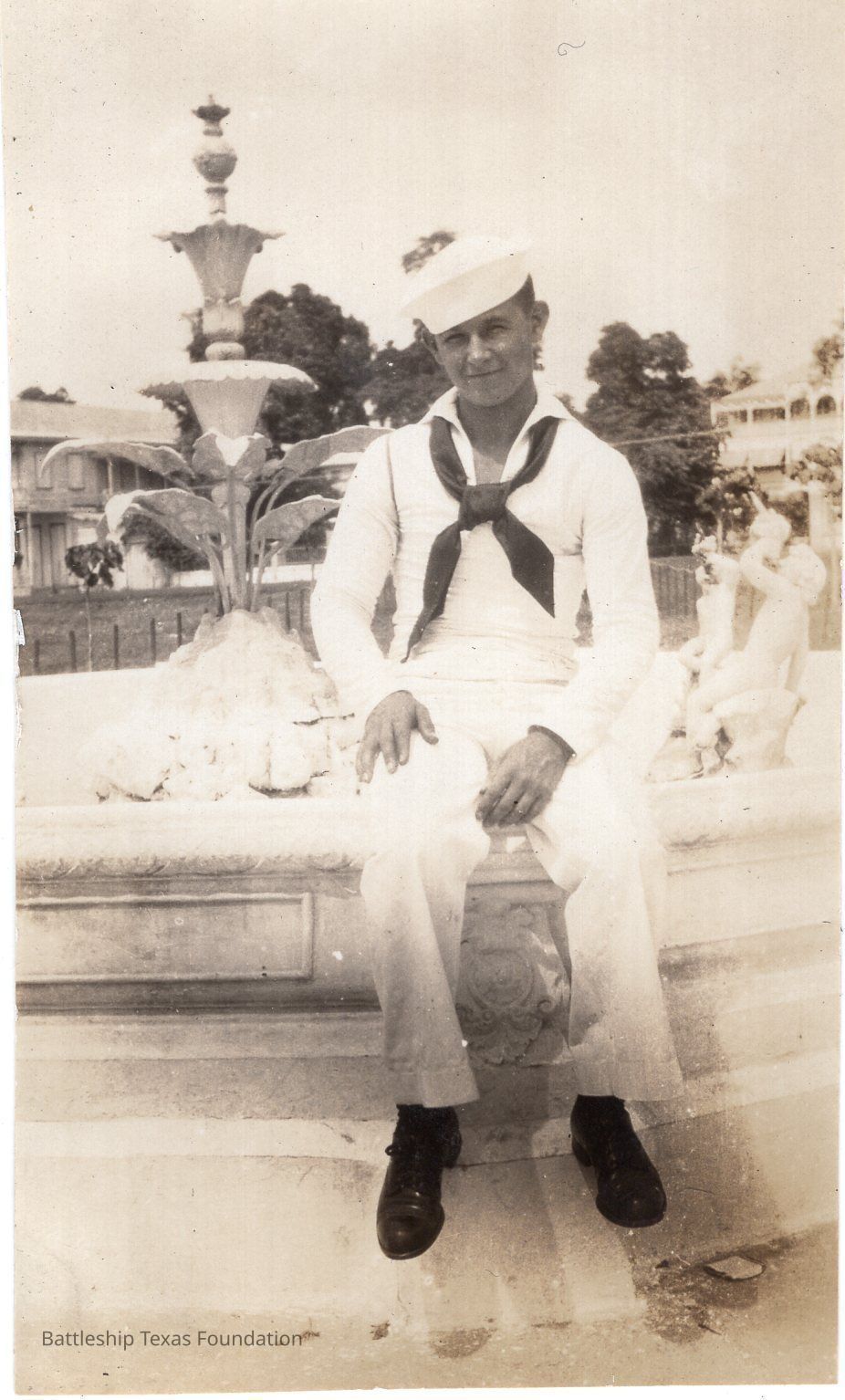 Features a sailor sitting on the edge of a fountain.Context