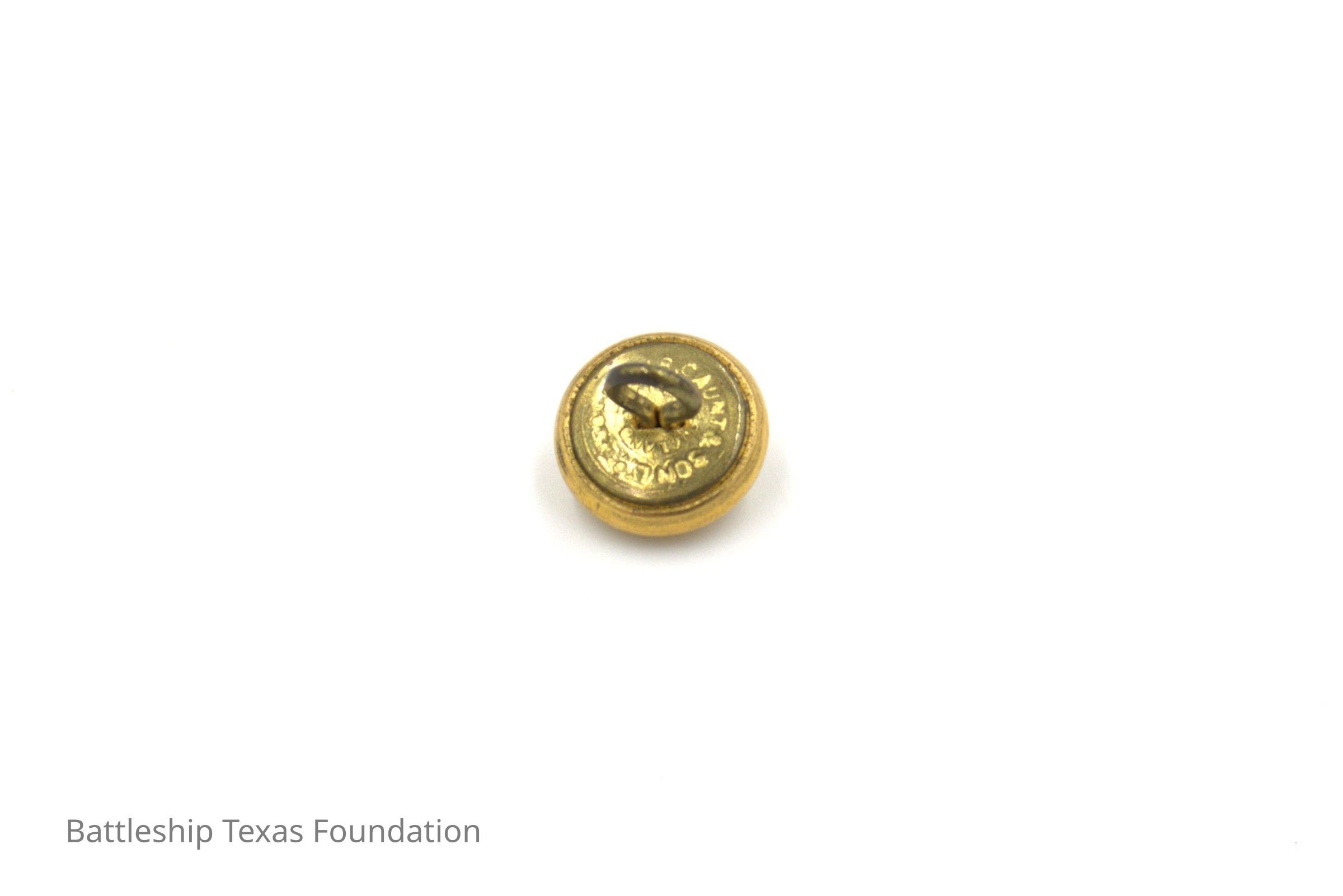 One of fifty-two individual gold buttons owned by Charles R. Pratt as spares for his USN overcoats. Button features an eagle perched on an anchor on the front. This variety is smaller than the regular size.