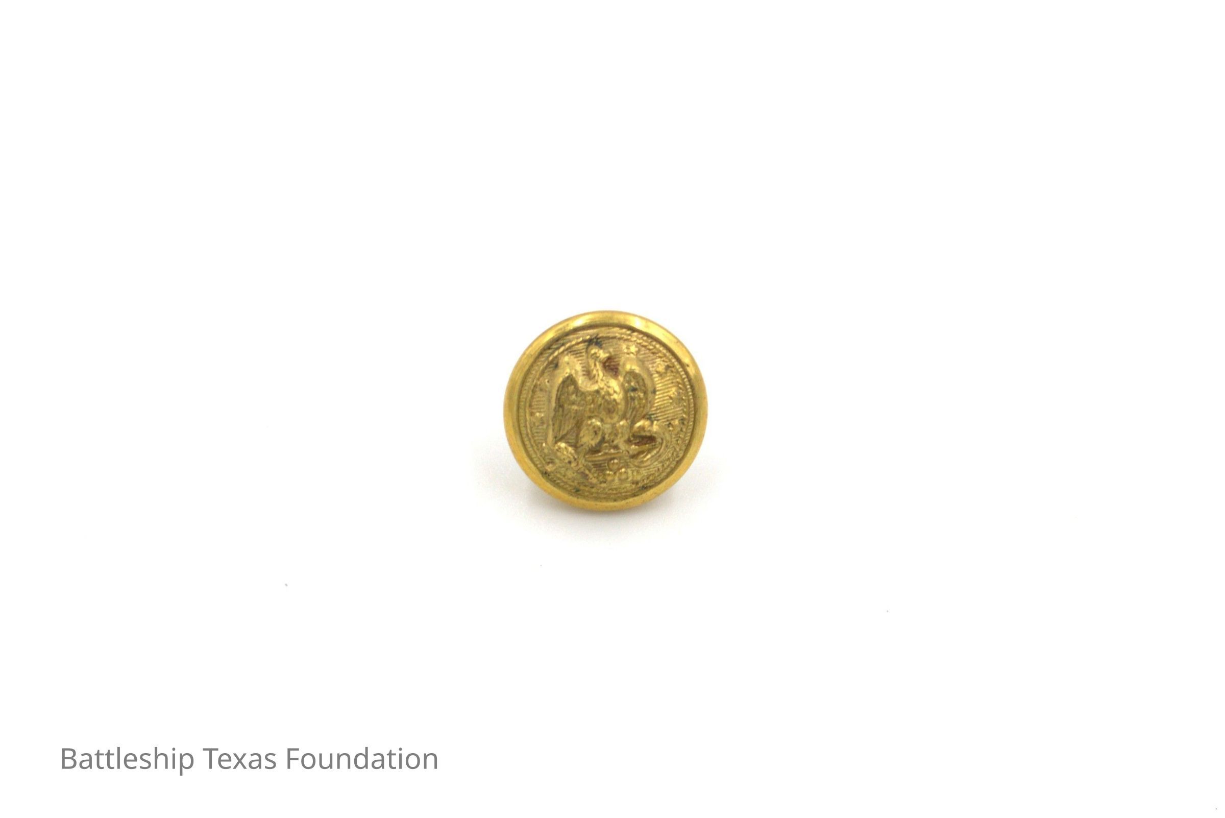 One of fifty-two individual gold buttons owned by Charles R. Pratt as spares for his USN overcoats. Button features an eagle perched on an anchor on the front. This variety is smaller than the regular size.
