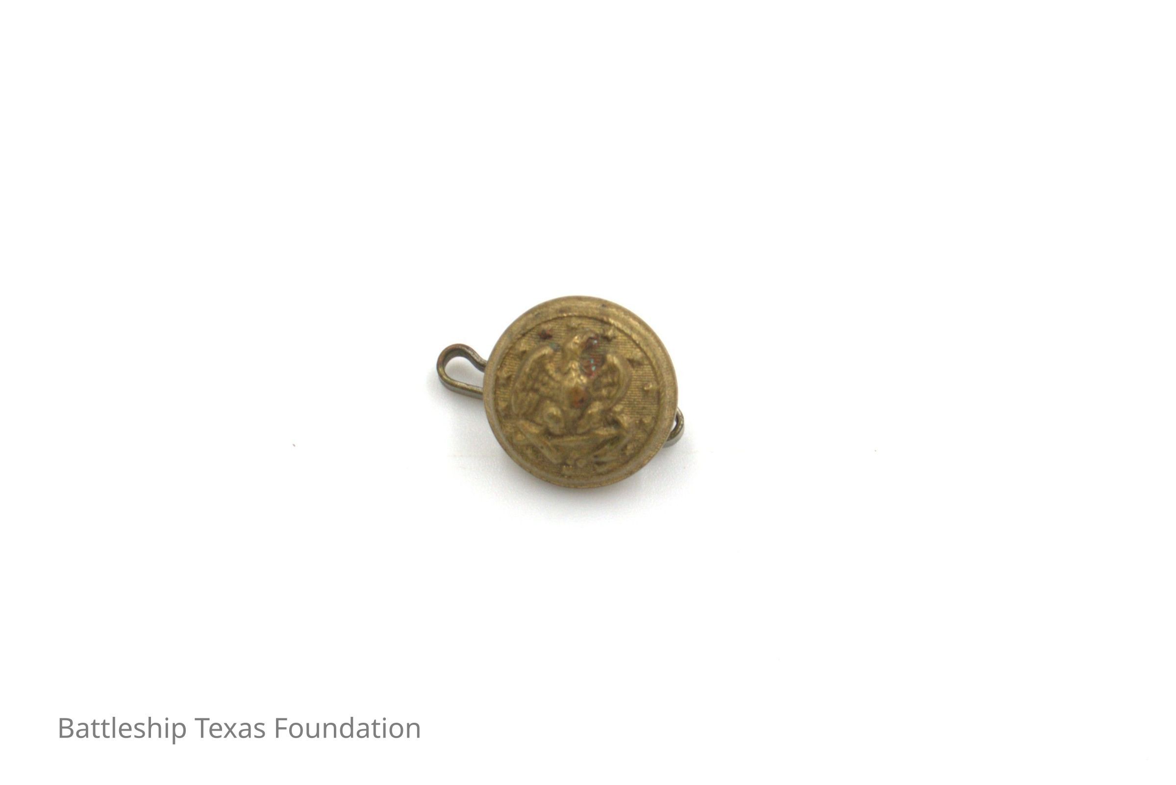 One of fifty-two individual gold buttons owned by Charles R. Pratt as spares for his USN overcoats. Button features an eagle perched on an anchor on the front. This variety is smaller than the regular size.
