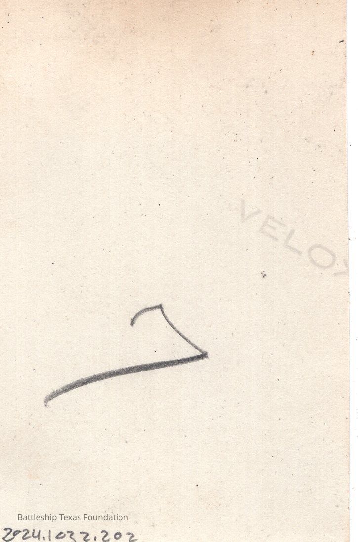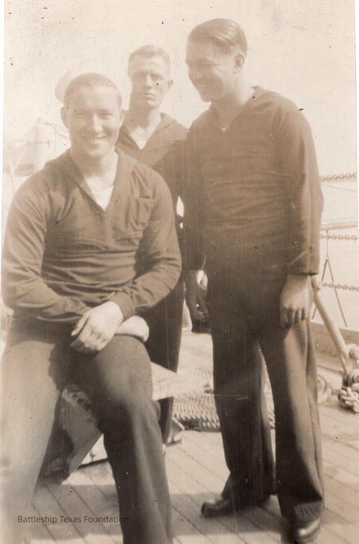 From a donated collection of individual photographs and pages out of a Texas crewmember's photo album. Items donated by the Los Angeles Maritime Museum. Many photographs had writing on the pages of the book, now discarded. The caption formerly on the page for this photo read, "PAL, YORK + BENNER"
