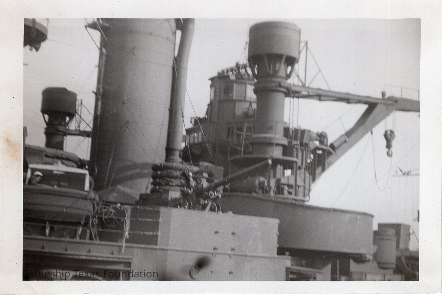 Crooked shot of smoke stack, aft fire control, and crane.Context