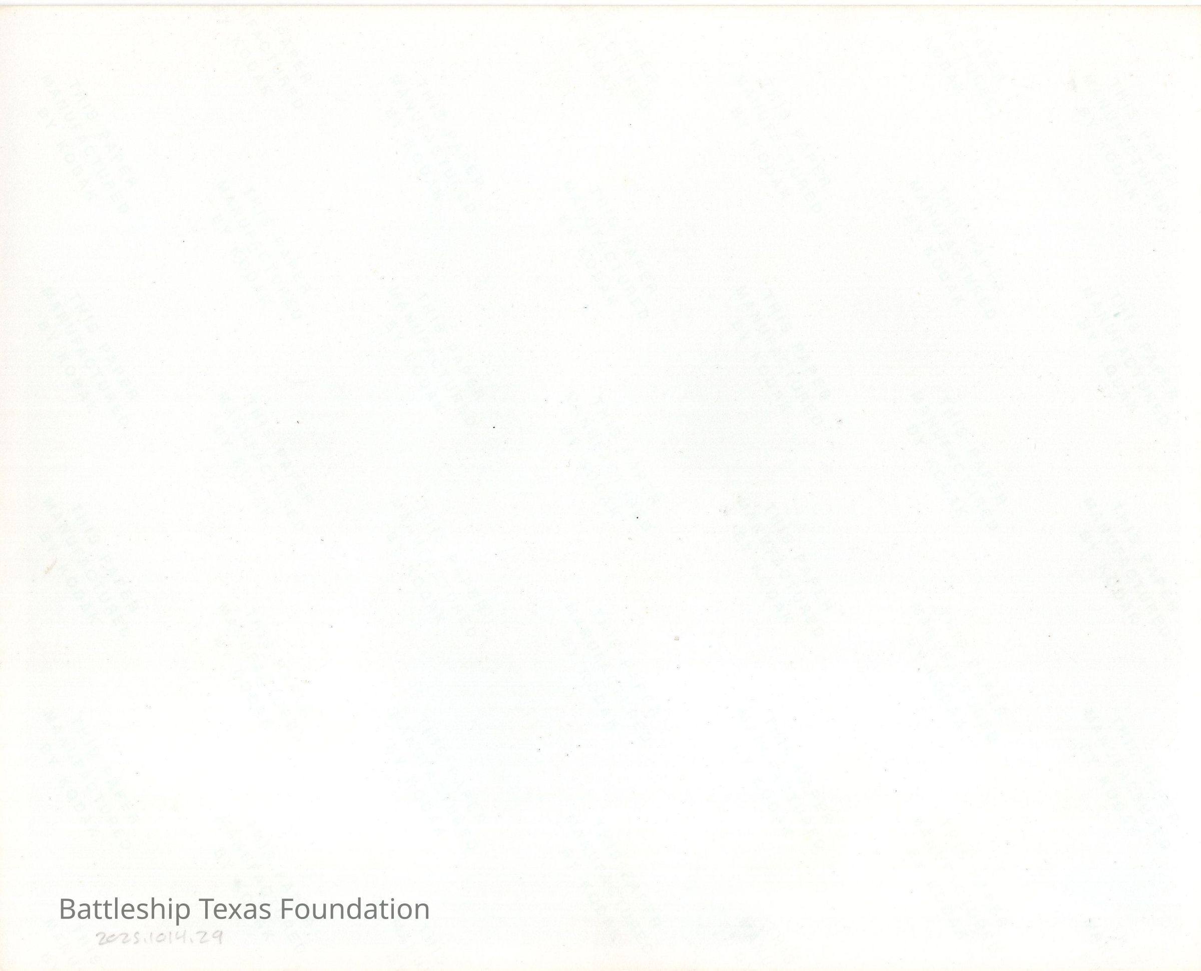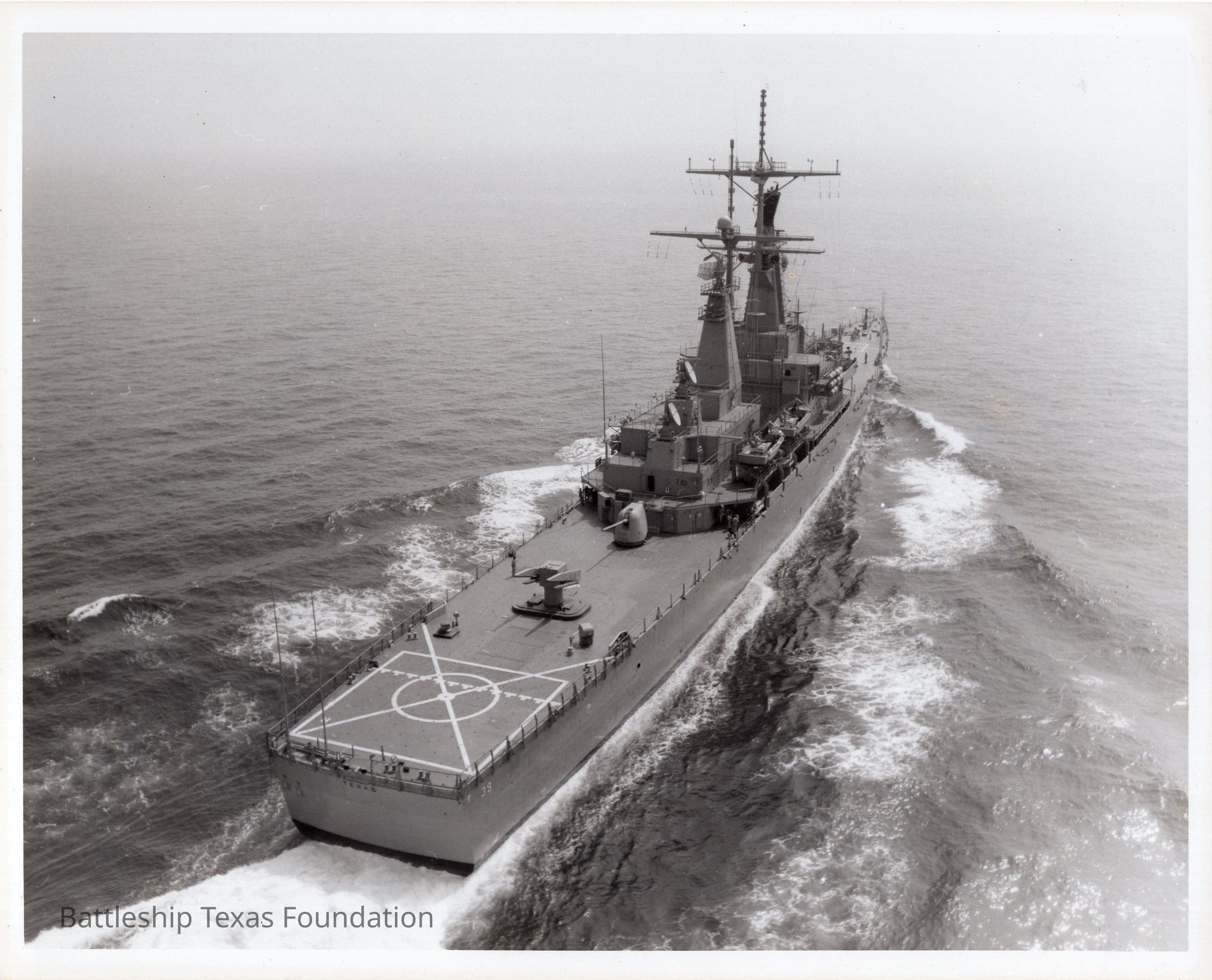 B&W photo of the starboard stern of Cruiser Texas as she sails away from the camera.Context