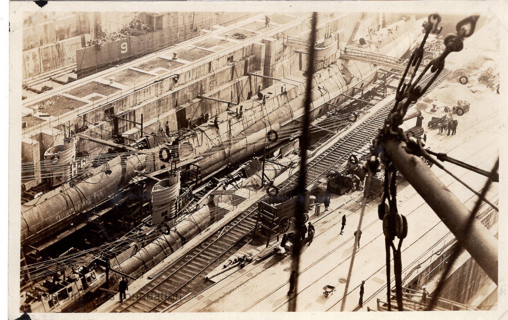 Features three submarines side by side in dry dock. Largest is the USS T-2, and the smaller two behind it are H-class.Context