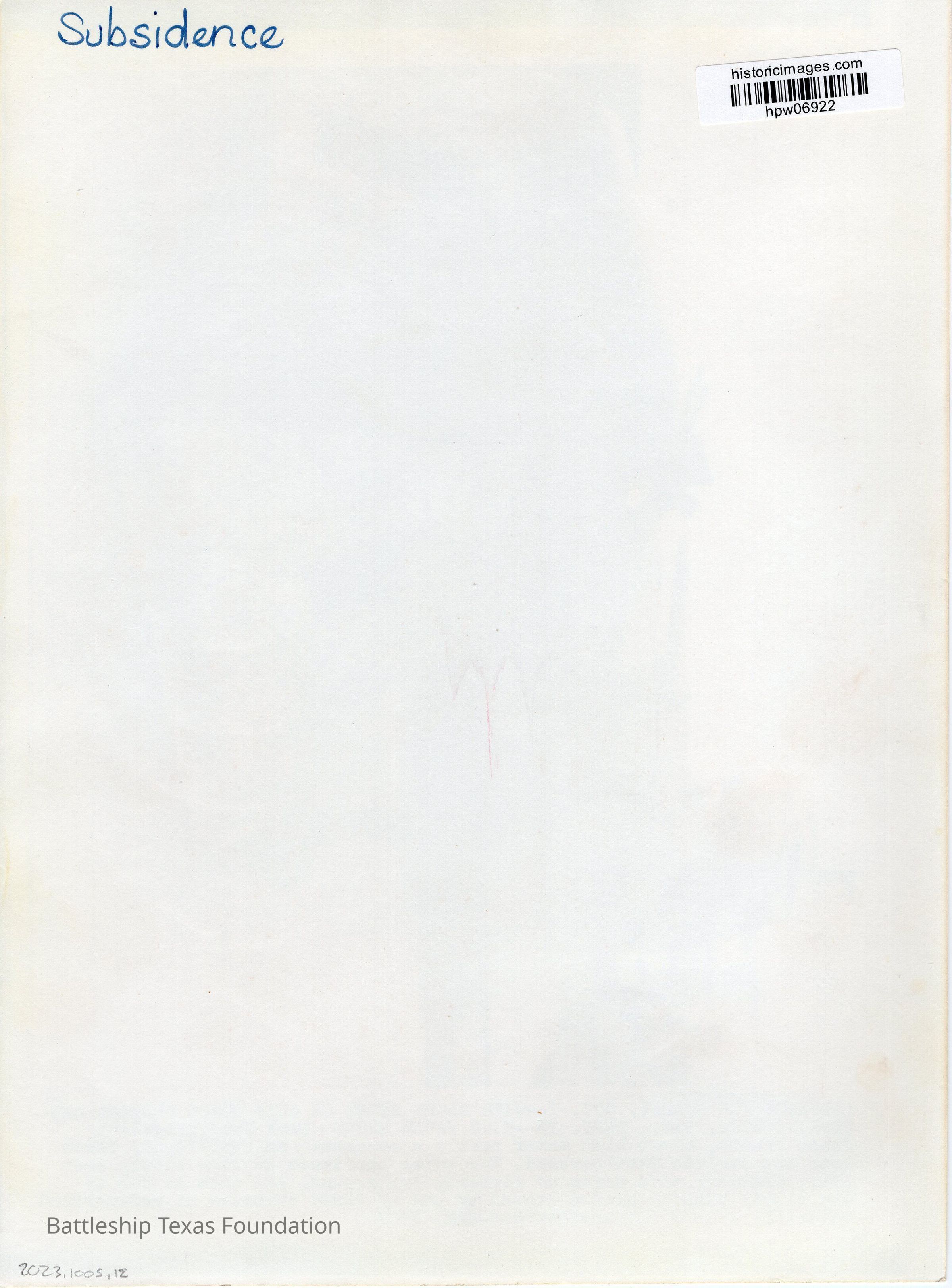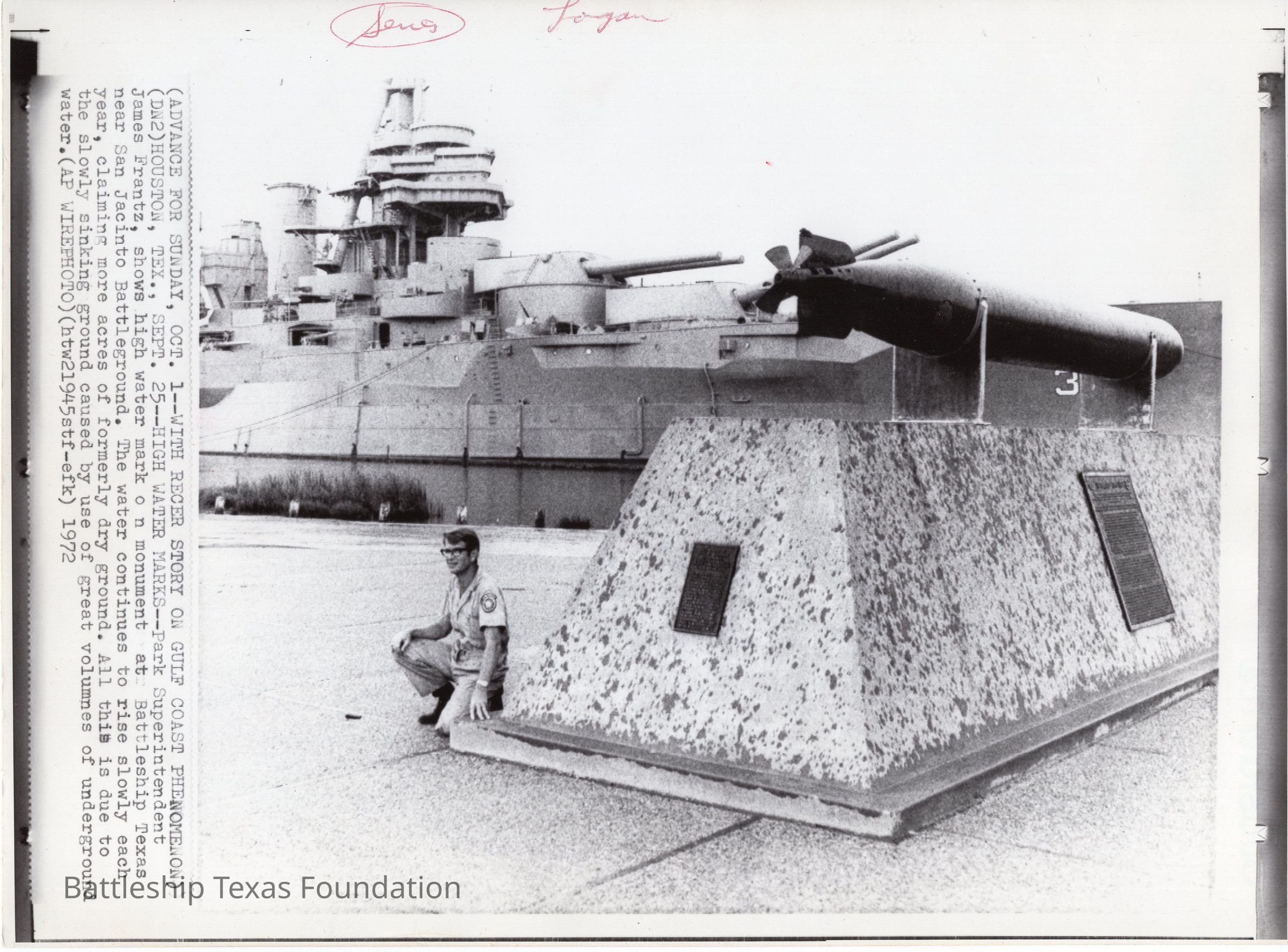 Man kneeling next to torpedo. Texas in background with turret #1 raised to max elevation. Caption on left side of the photo "ADVANCE FOR SUNDAY, OCT. 1..." and back says "Subsidence" written in blue pen.Context