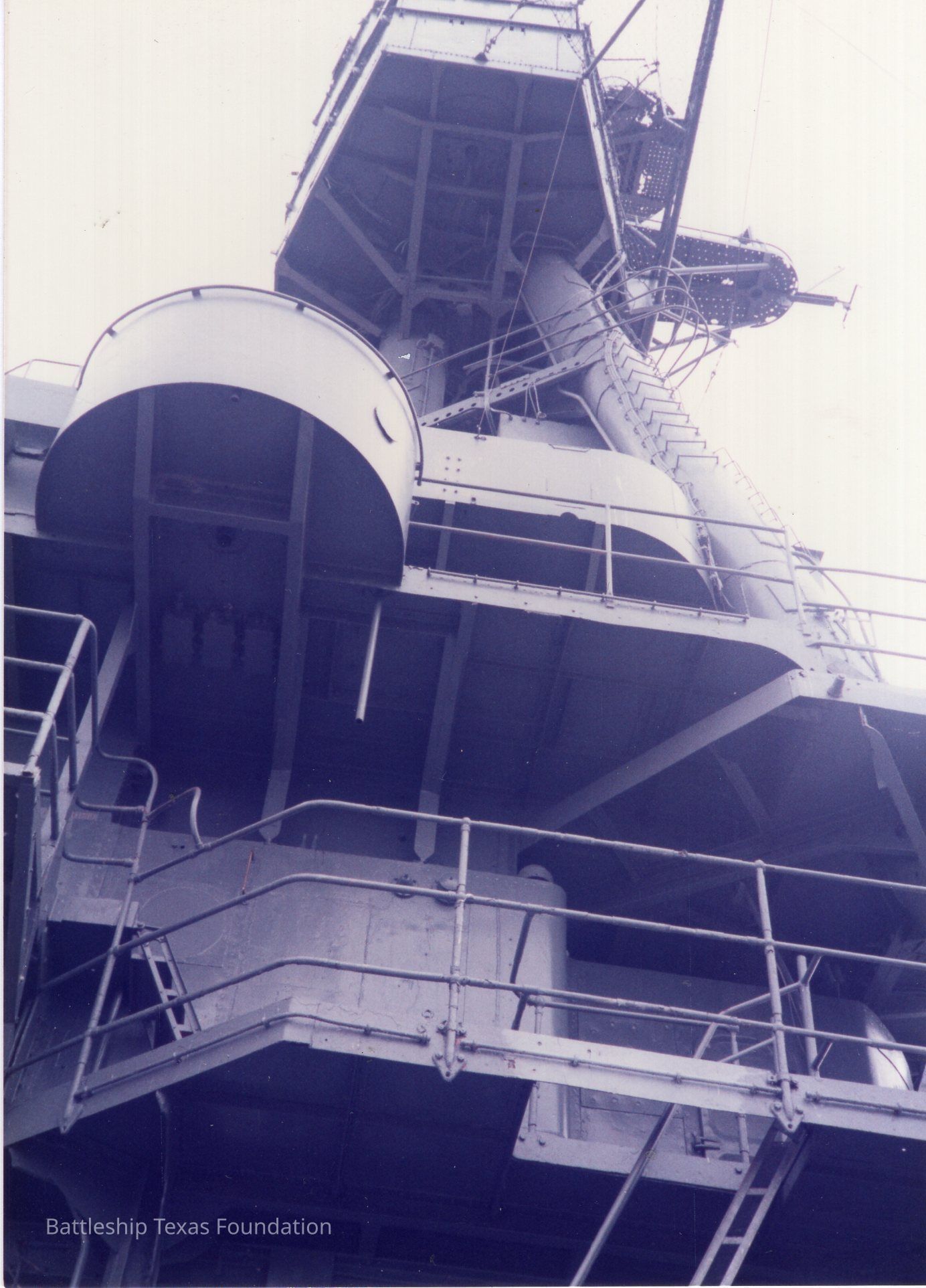 Shot of the superstructure and bottom of the foretop on the port side of the ship on a cloudy overcast day. No visitors visible.Context