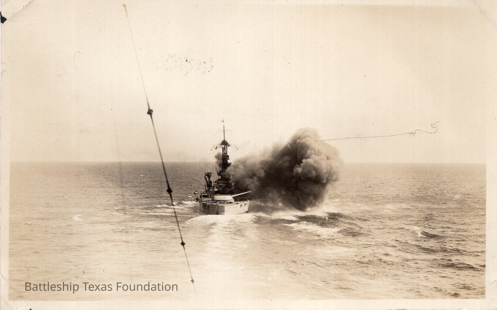 Features Texas firing over her starboard. Large smoke explosion out of main turrets.Context