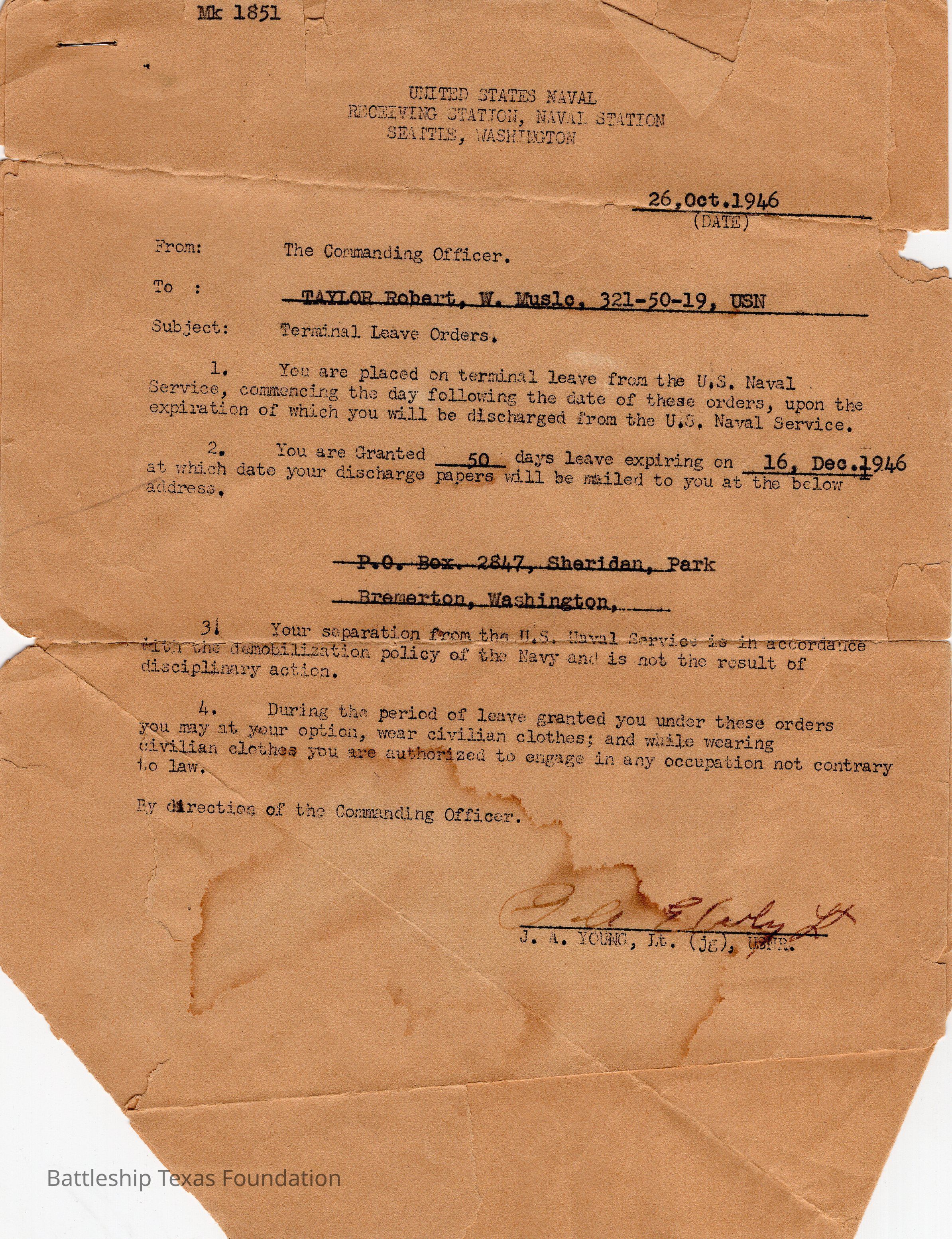 Robert Taylor's notice of his termination in the US Navy as a result of the demobilization in the postwar world. Paper torn, creased, and missing portions near the bottom.Context