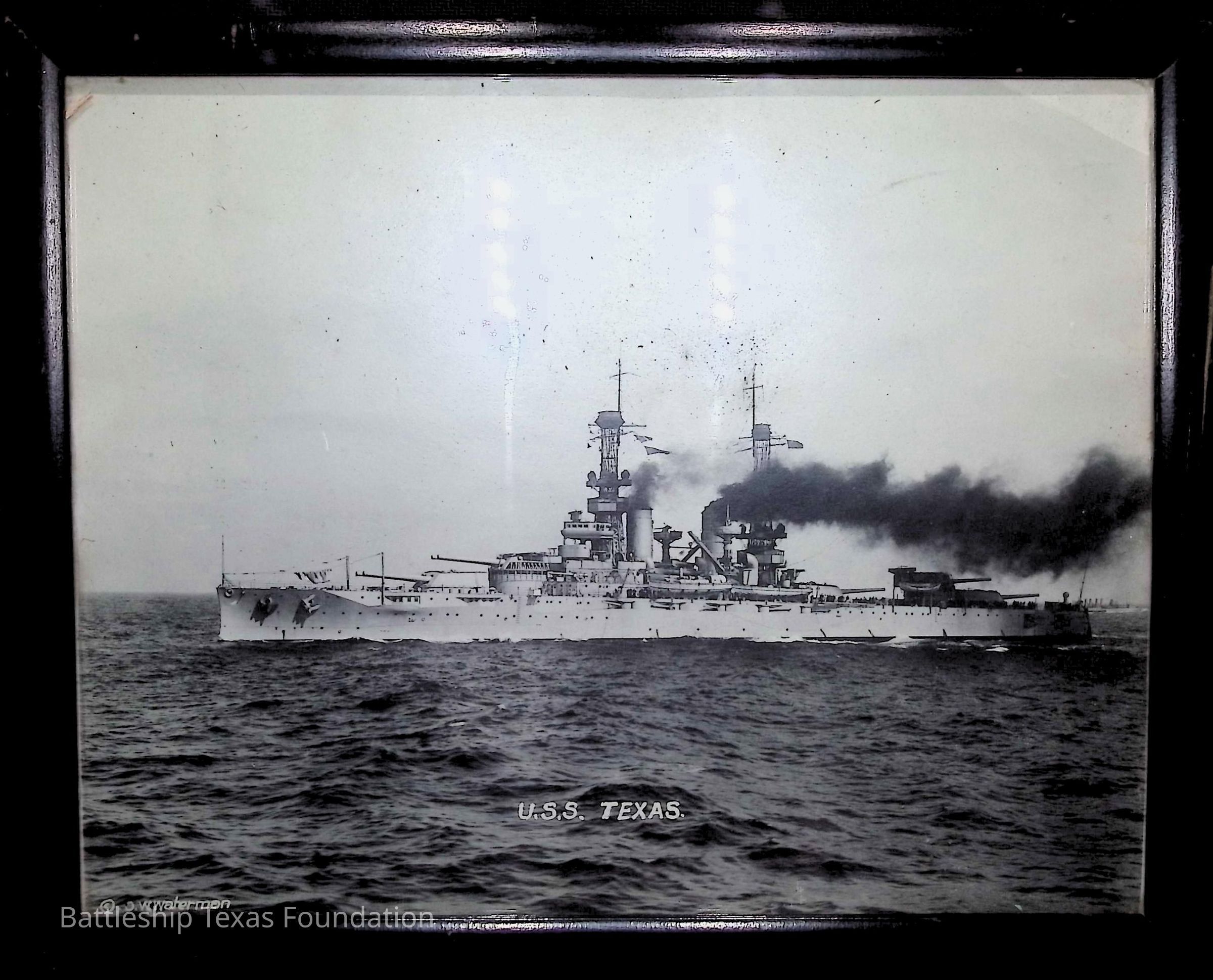 Framed photo of Texas sailing to the left, smoke coming out of stacks, and captioned "U.S.S. TEXAS" in a black frame. Frame wood splintered on right side.Context