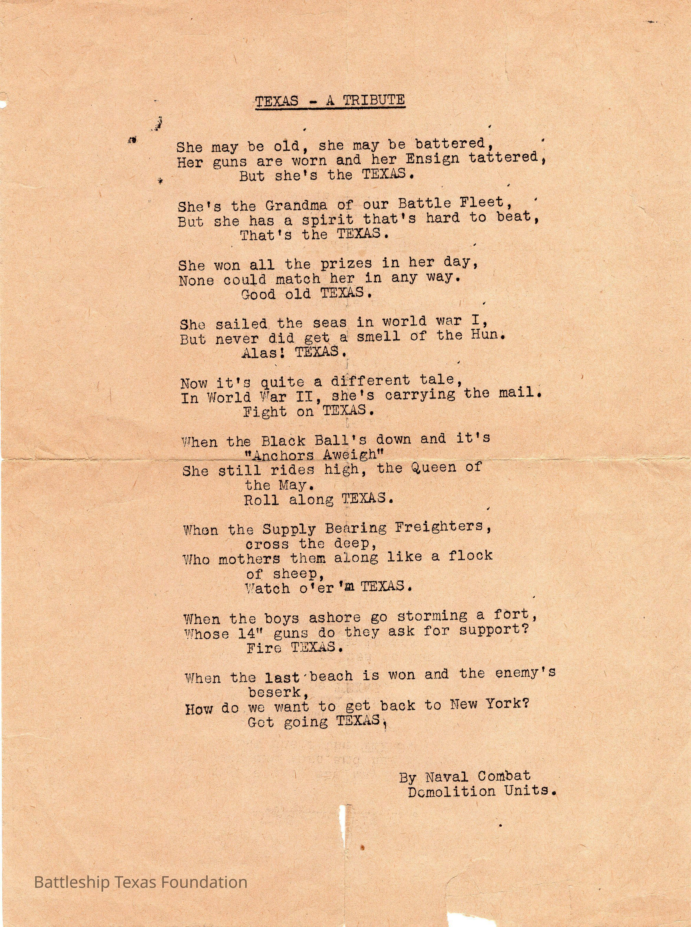 Poem about Texas by the Naval Combat Demolition Units.Context