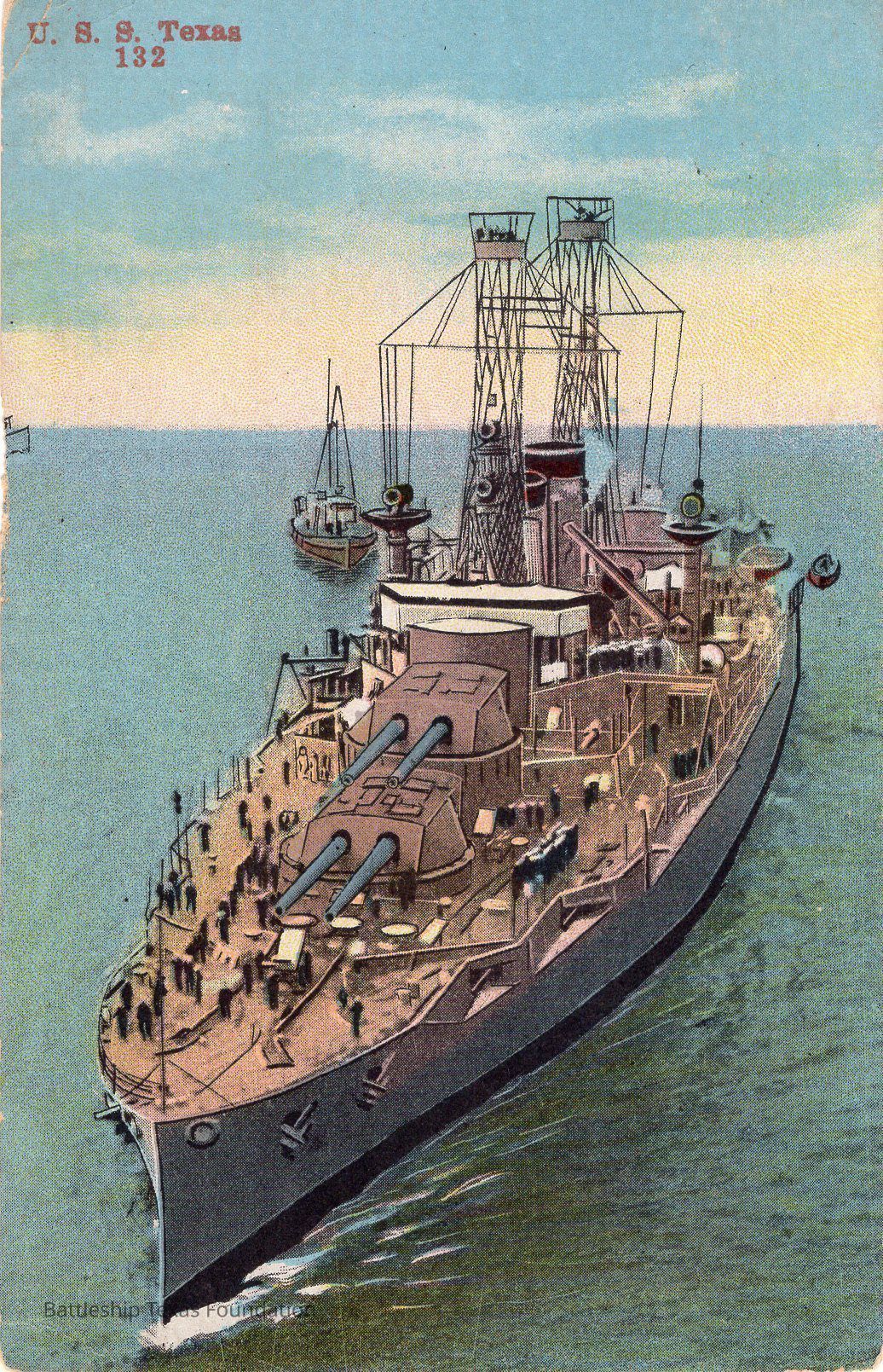 Postcard of artwork of Texas. Features ship sailing towards POV, with small craft behind her. Captioned on top left "U.S.S. Texas 132"Context