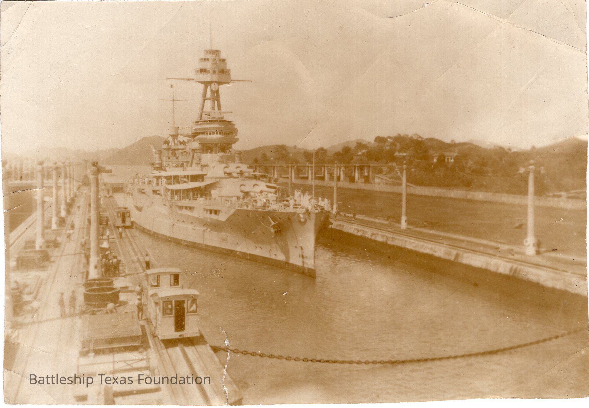 Texas sailing toward chain gate in Panama Canal. Photo is folded in top corners.Context